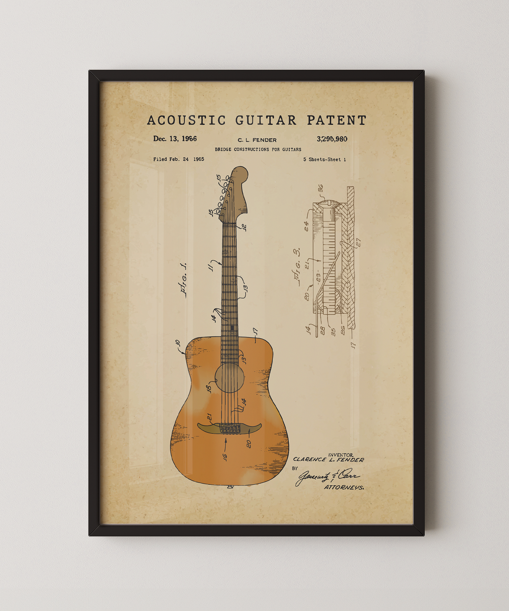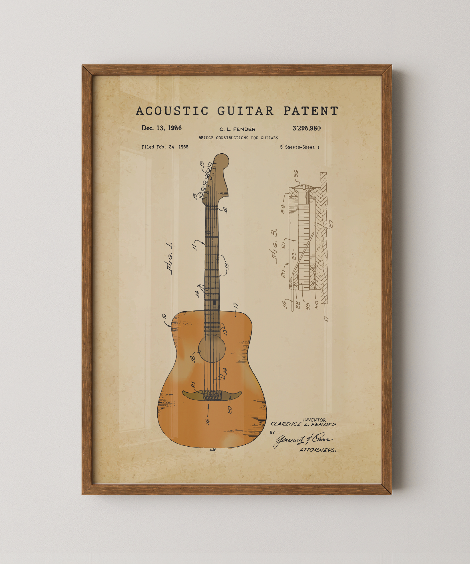 Soft wood, open soundhole, vibrating strings: this print turns the patent for an acoustic guitar into a visual hymn. Every technical detail becomes part of a larger melody—engineering meets art, and the instrument becomes both object and icon, beautifully painted.