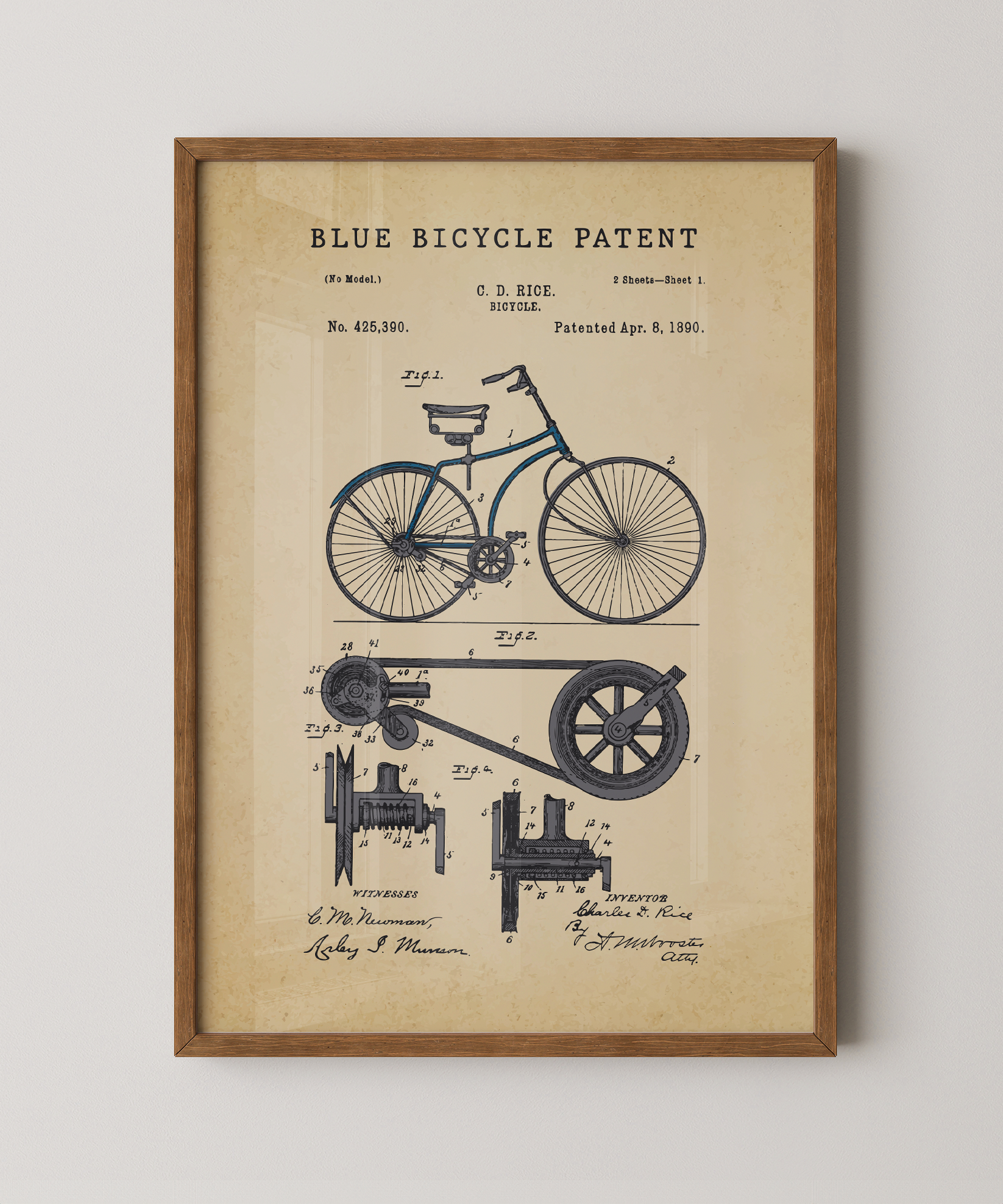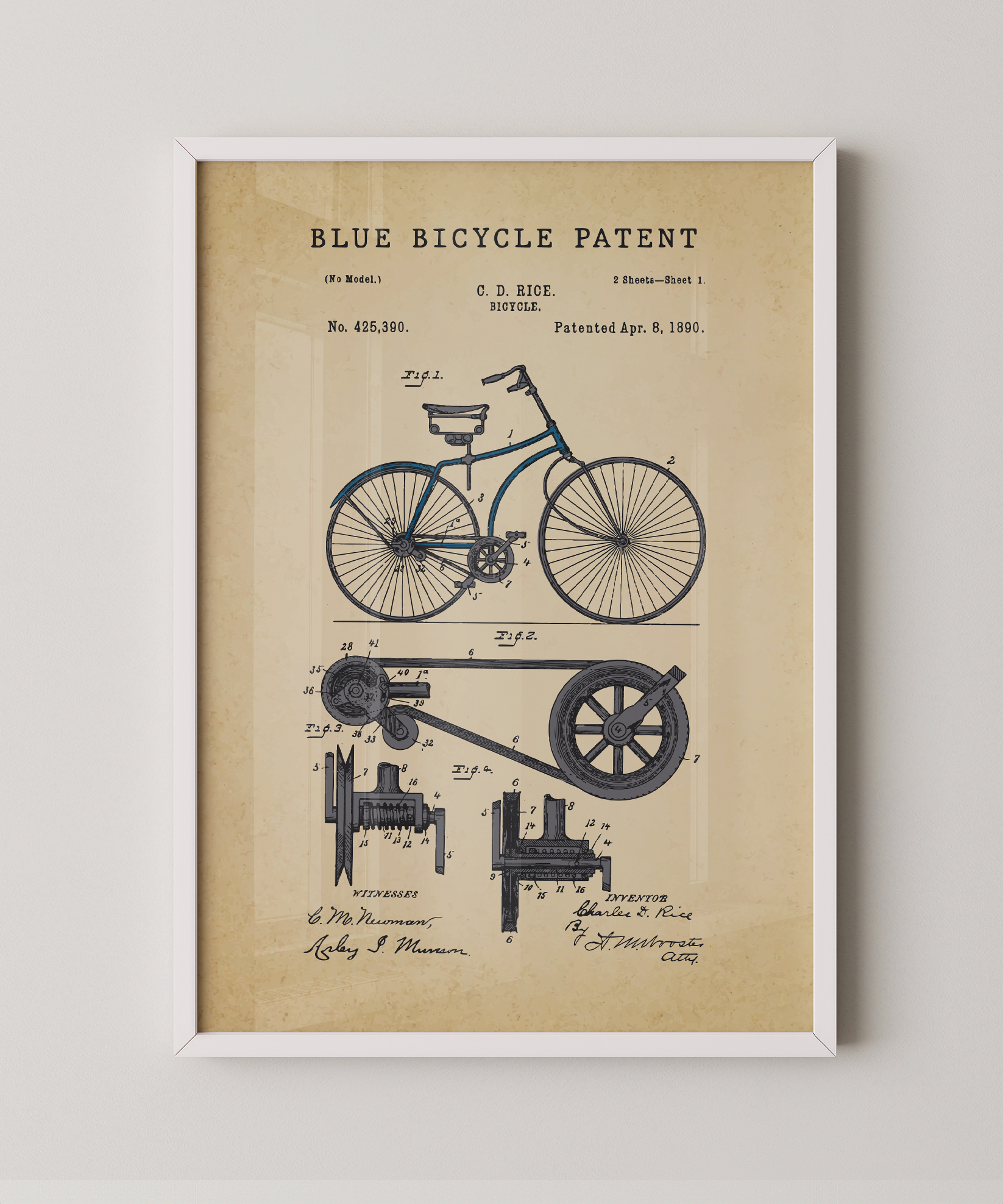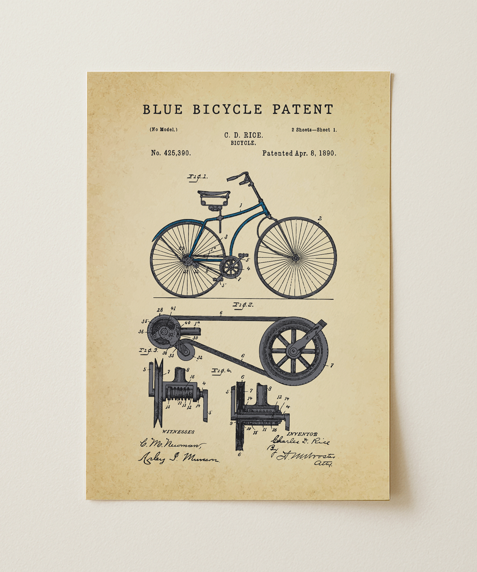 This print revives the patent of a classic bicycle frame, each line carefully painted to echo the promise of motion, freedom, and open roads. You can almost feel the spokes spin, the wind lift at your shoulder, the horizon beckon with possibility. Whether you ride for the adventure, the commute, or the memory of your first bike, this piece transforms engineering into art—celebrating balance, design, and the simple joy of going places.