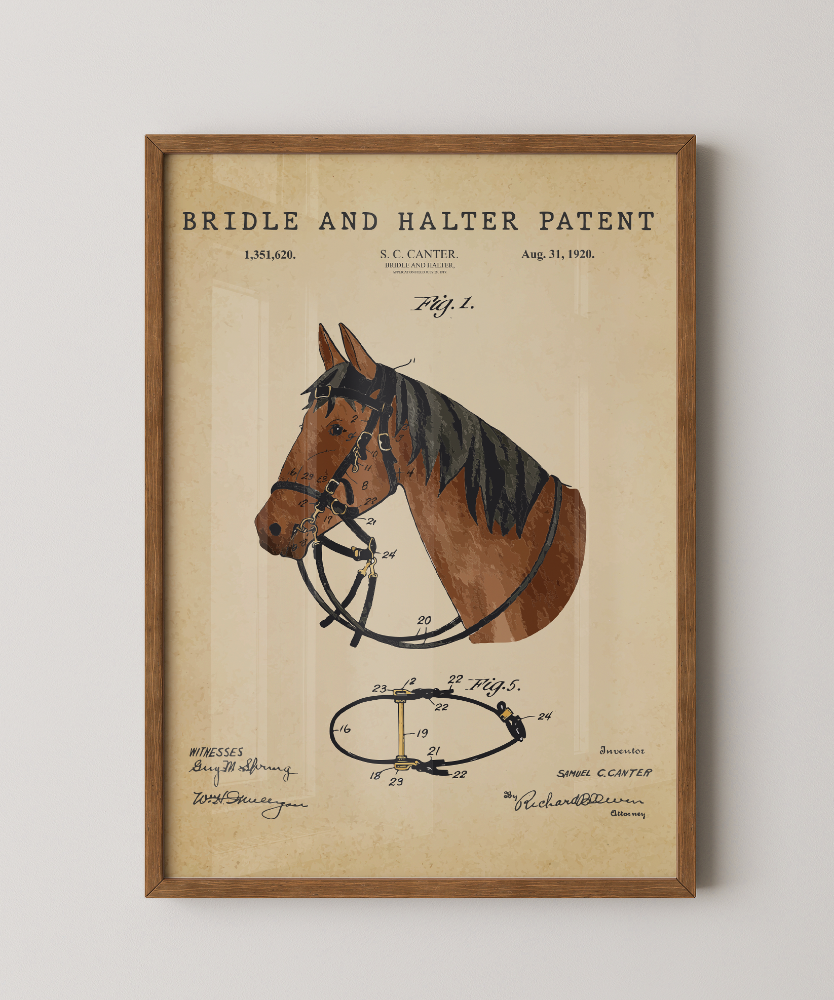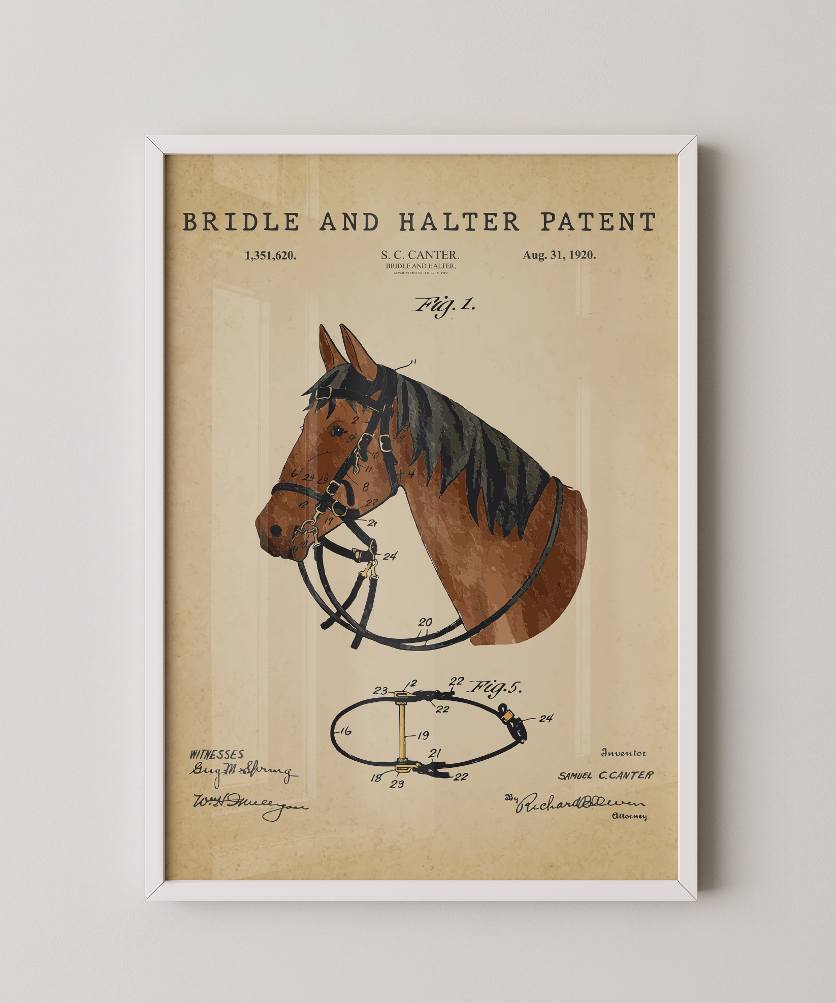 A union of form and function drawn in graceful ink. This bridle and halter patent elevates its elegant lines into refined wall art that feels both timeless and deliberate. Hung in your space, its contours evoke quiet stables, moments of trust between rider and steed, and the beauty of thoughtful design. A tribute to craftsmanship, motion, and the enduring spirit of creative heritage.