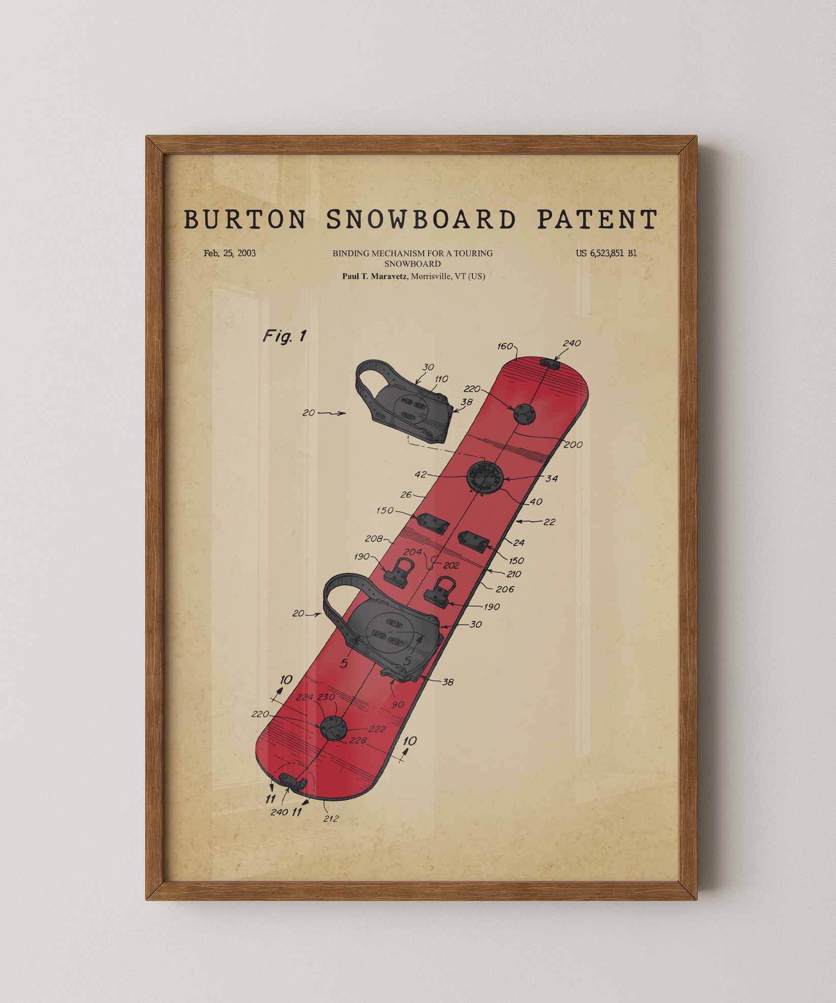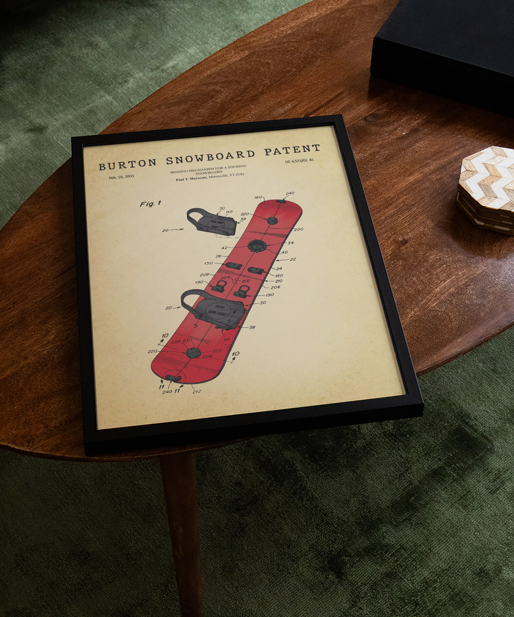 A shape of freedom drawn in graceful ink. This Burton snowboard patent elevates its sleek form and purposeful curves into refined wall art that feels both timeless and expressive. Hung in your space, its lines evoke snow-covered slopes, the thrill of descent, and the joy of movement. A tribute to design, motion, and the enduring spirit of creative adventure.
