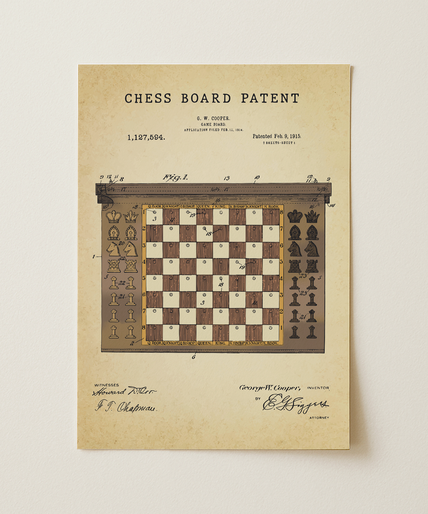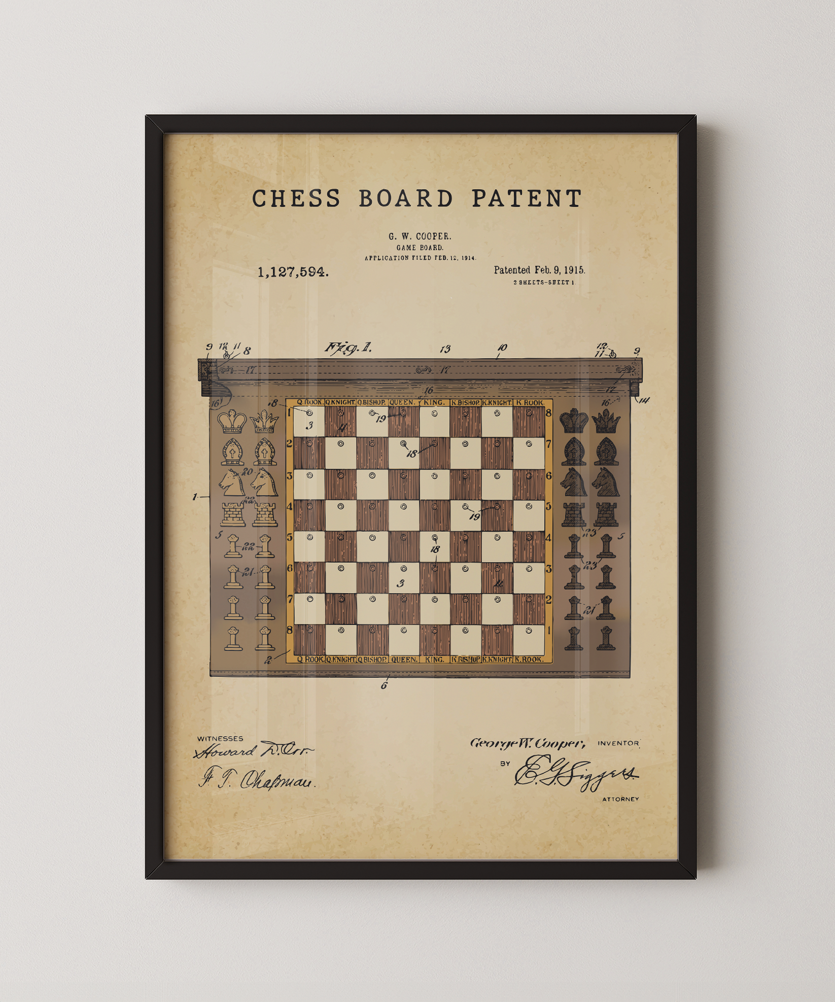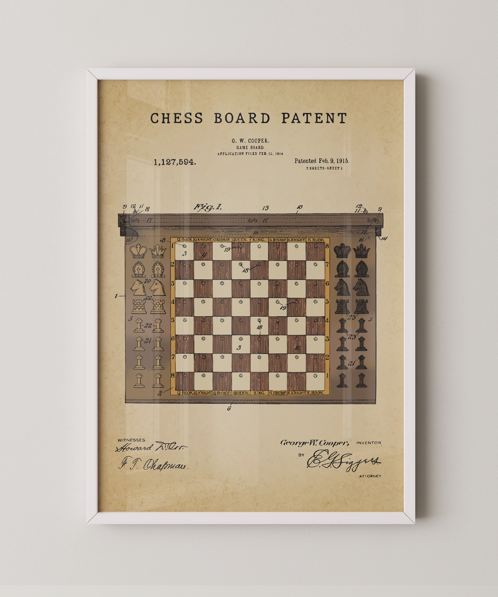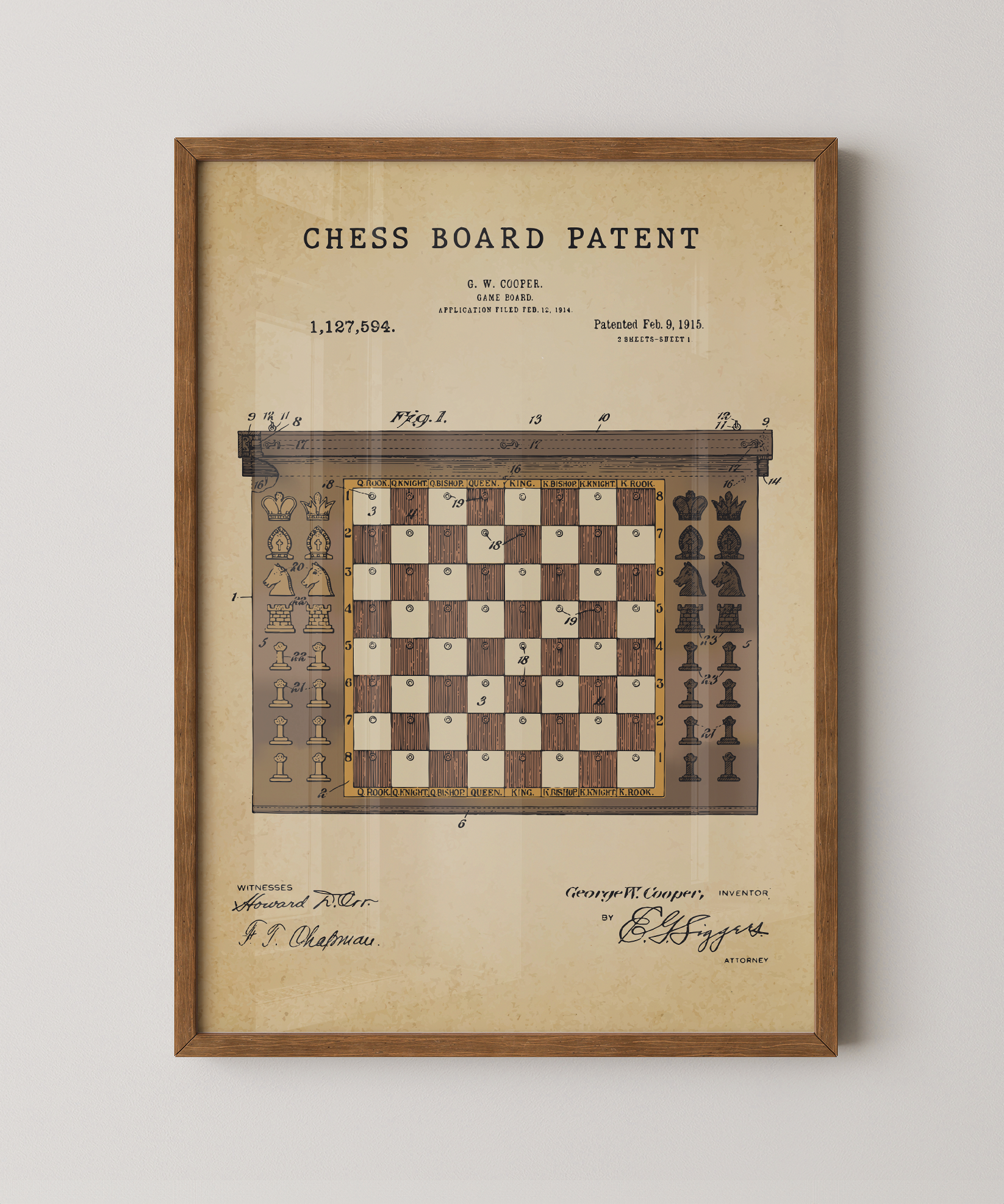 Strategy, stillness, intellect — this painted patent of the chessboard distills the battlefield of minds into art. Each square, each line, each suggestion of a game unfolds in quiet precision.