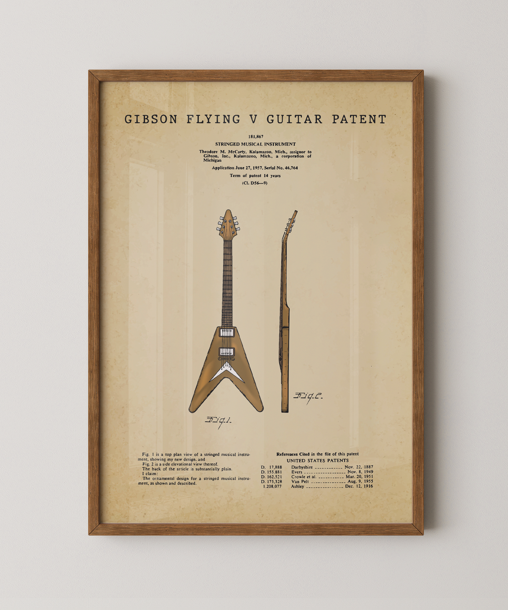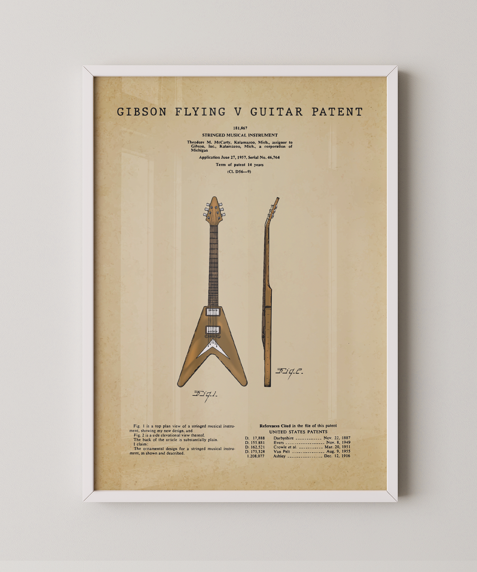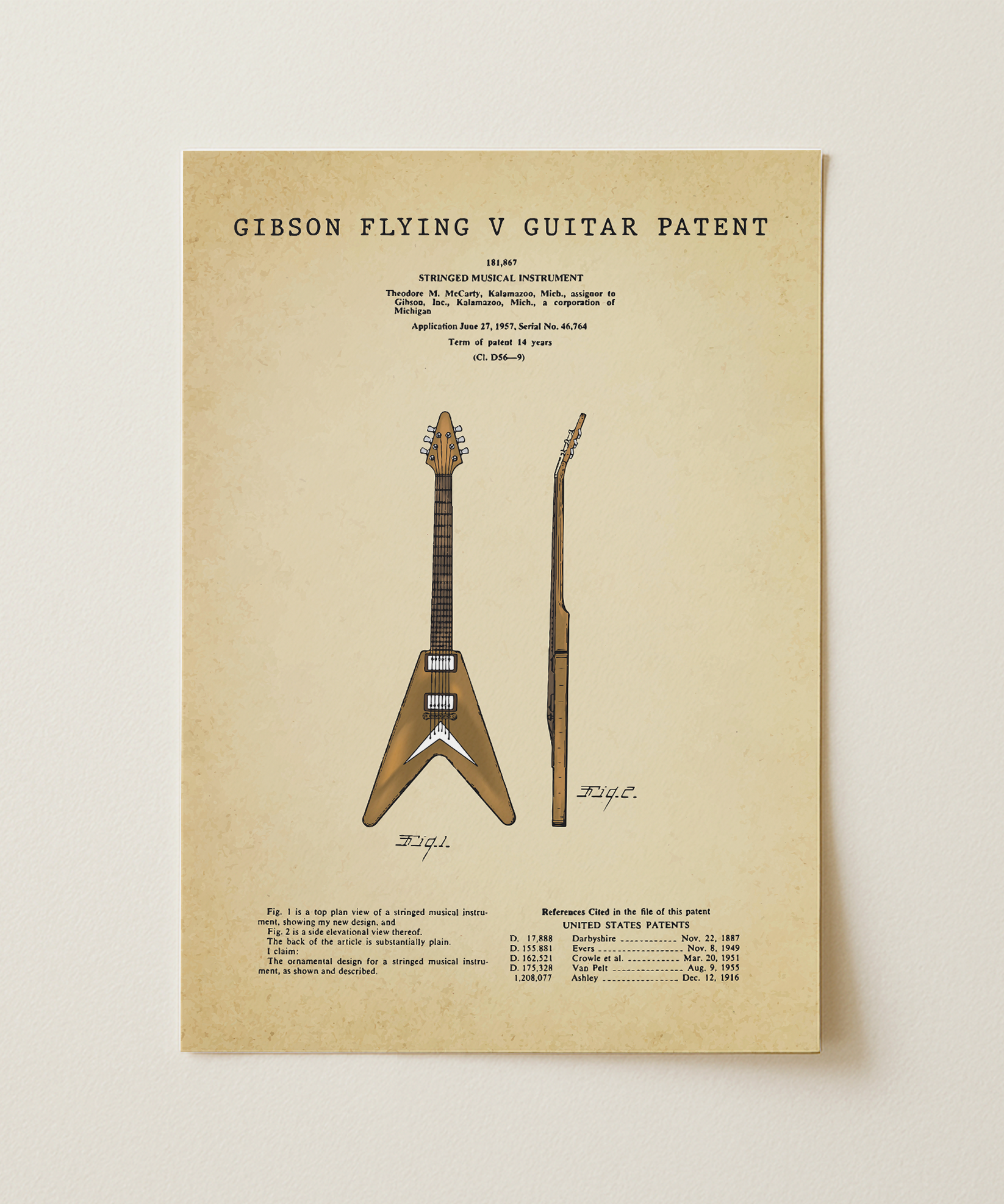 Bold edges, bold tone. This painted patent of the iconic Flying V captures the rebel spirit of rock. Every angle sings with attitude, every line nods to the legends who made noise and history with it.