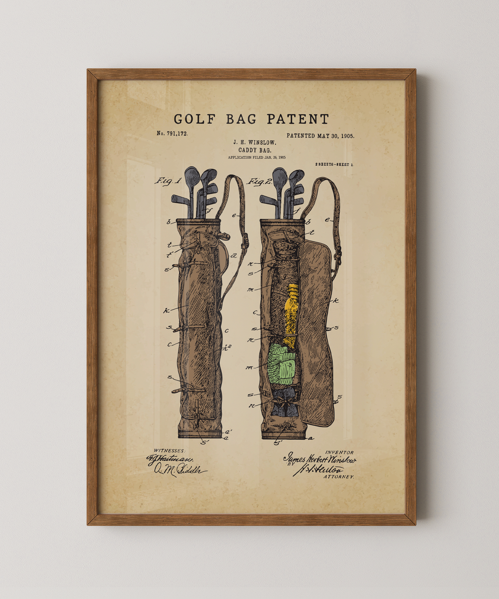 A carrier of dreams, a holder of clubs and hopes: this print brings to life the patent for a golf bag, turning functional design into art. The straps, the pockets, the stance—all become part of a painted story about preparation, journey, and the love of the game.