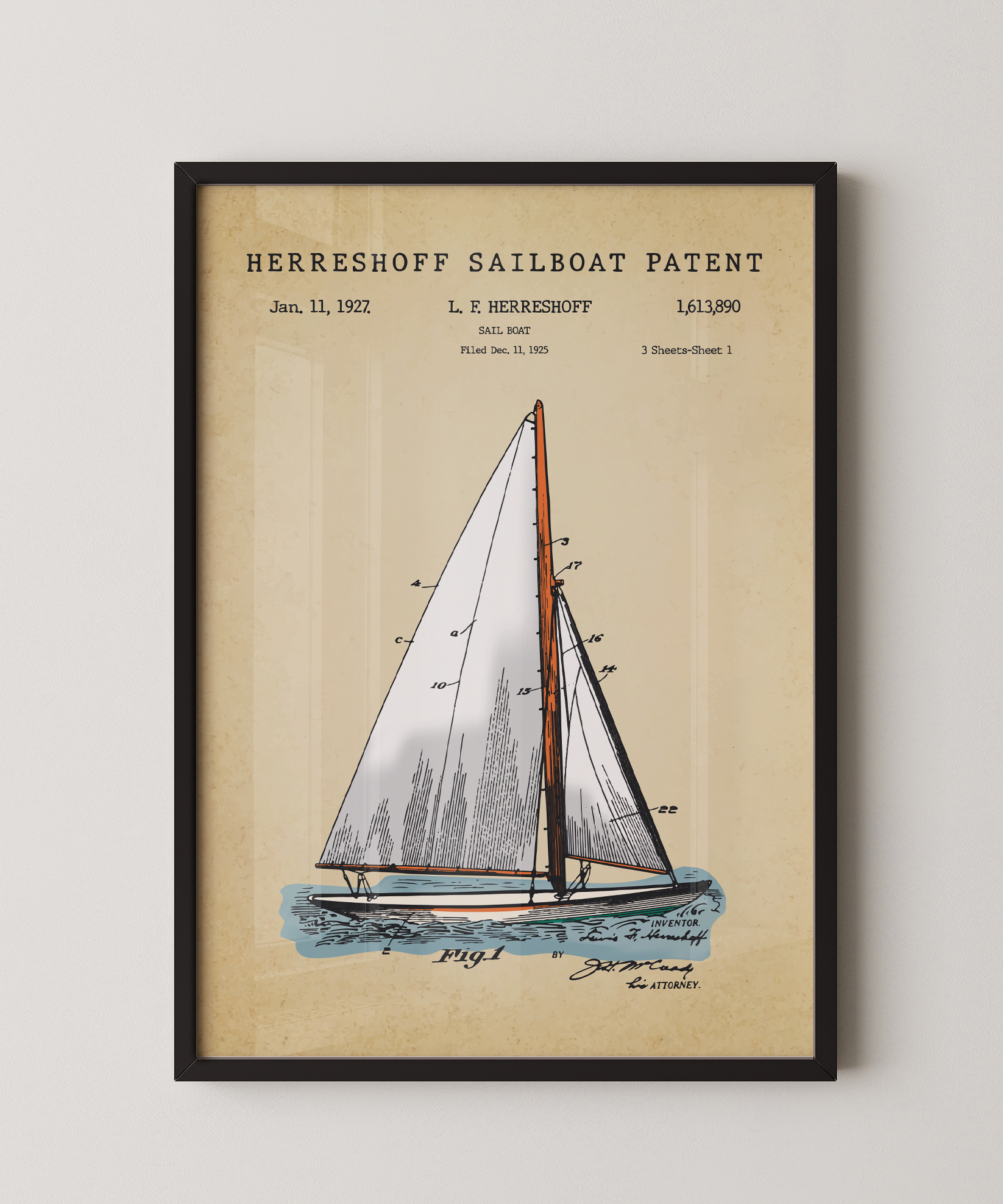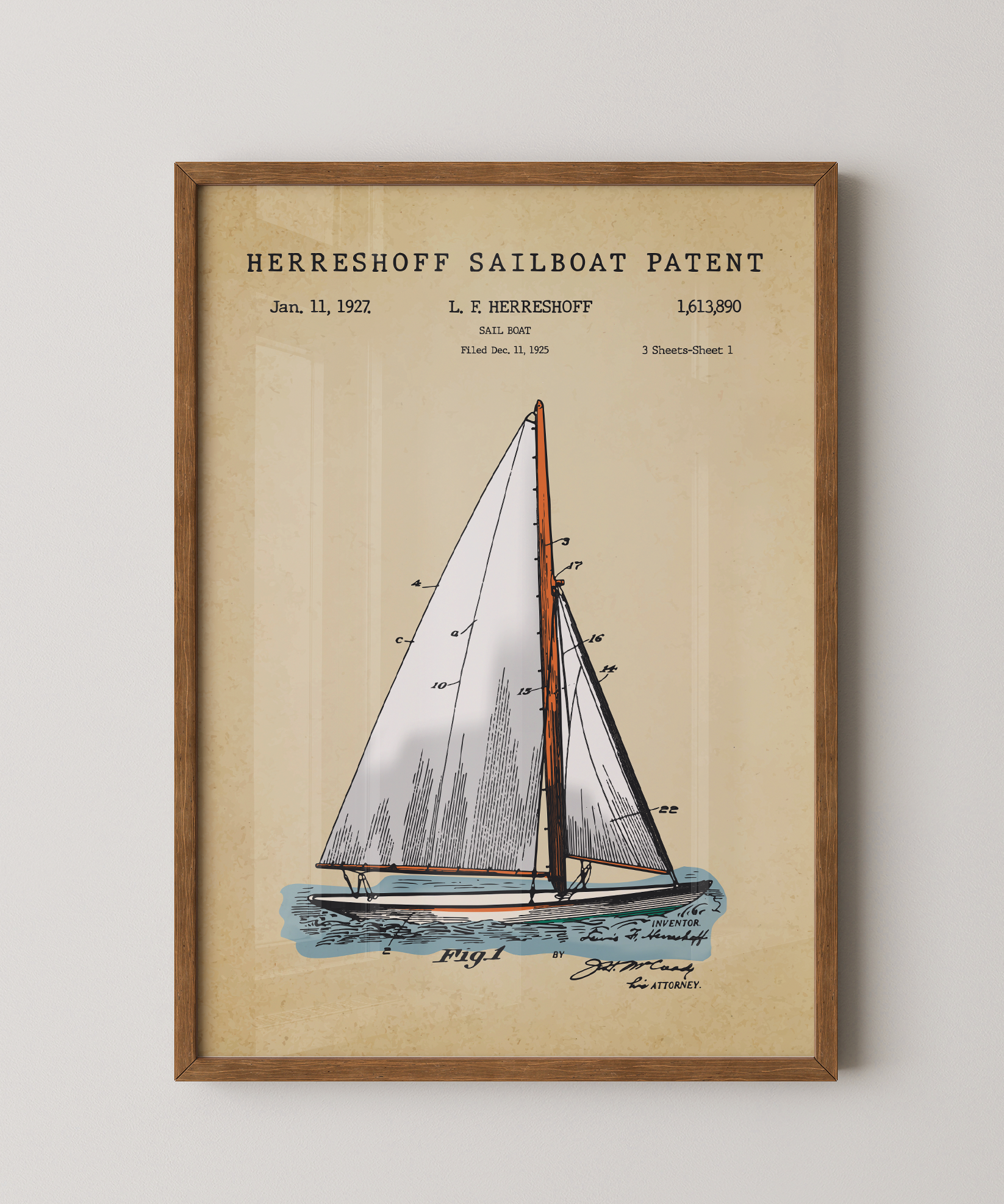 Wind, wood, and timeless craft — this painted patent print honors the Herreshoff sailboat. You can feel the swell beneath, the tension in the lines, the quiet freedom of open water.
