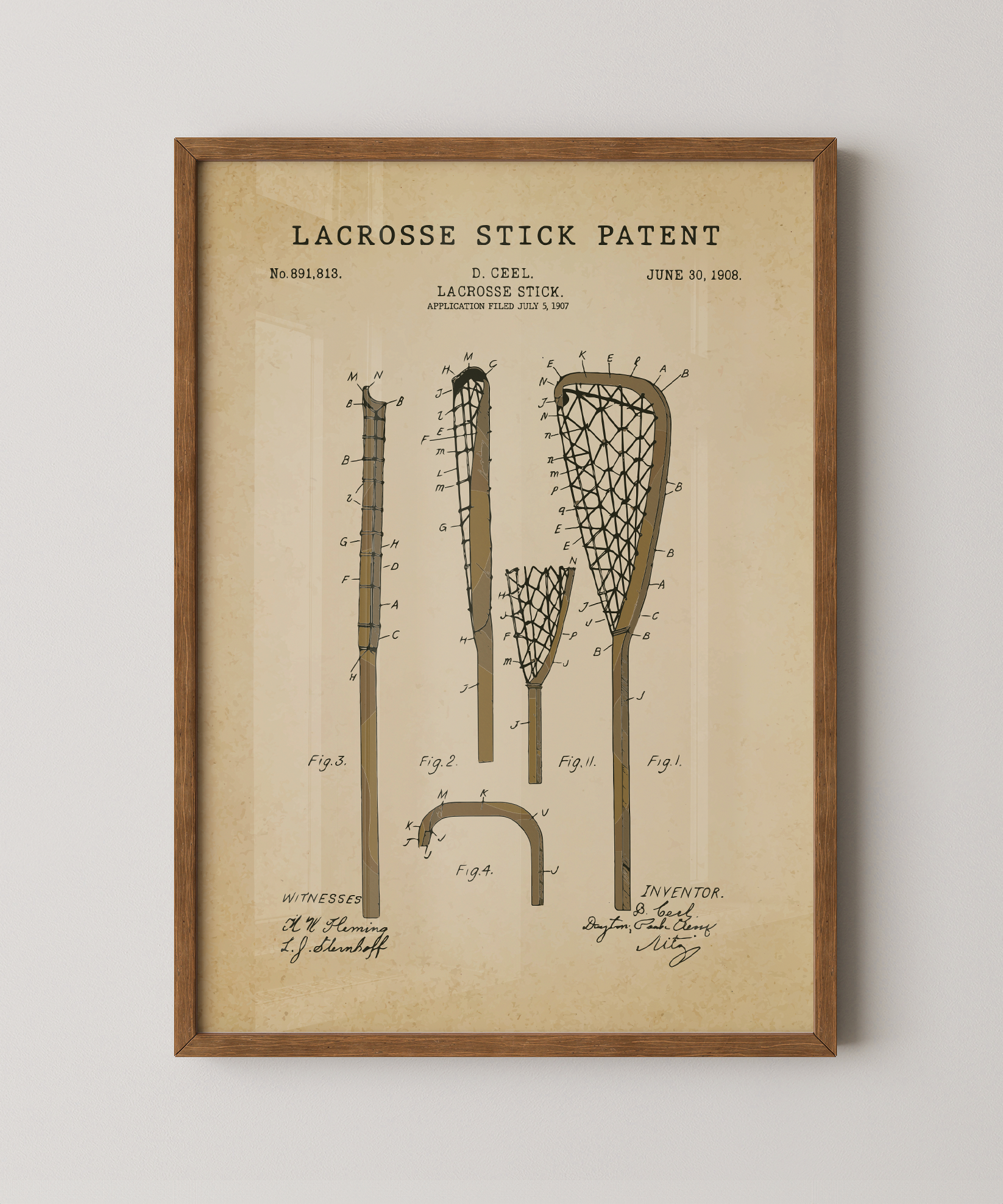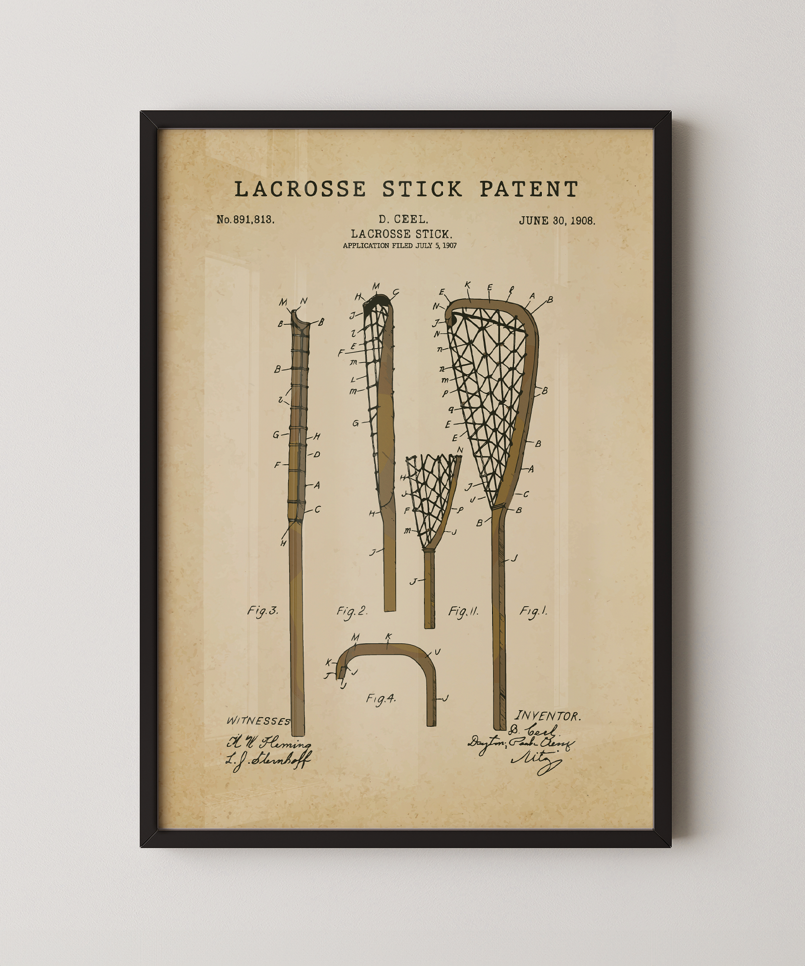 The crack of the shaft, the flight of the ball—this print freezes that moment of motion into a static drawing of invention. The original patent for a lacrosse stick becomes a line-work of purpose and power, reimagined and painted to honor the athlete’s control, the stretch and snap of the game, the shape that changed a sport.