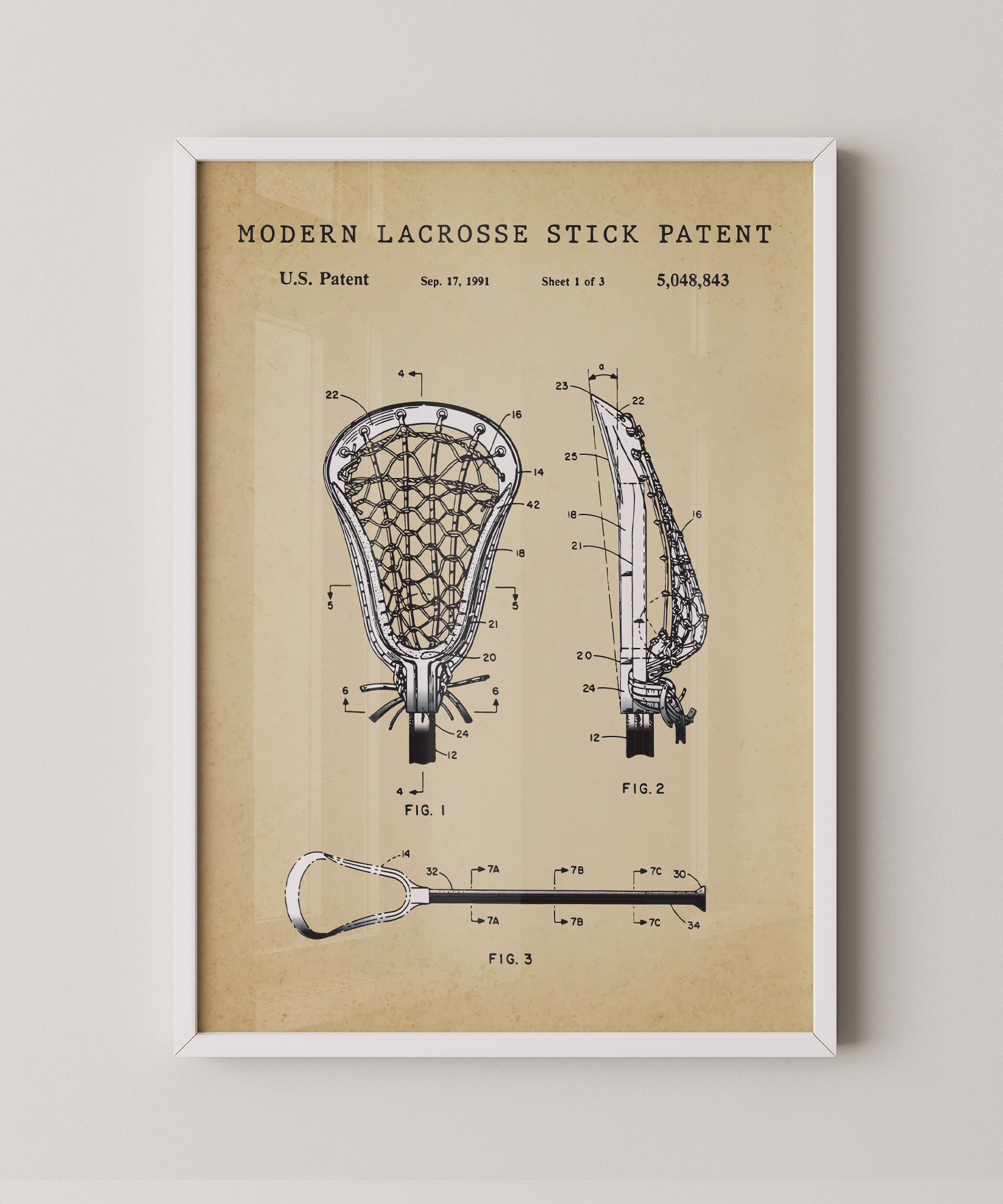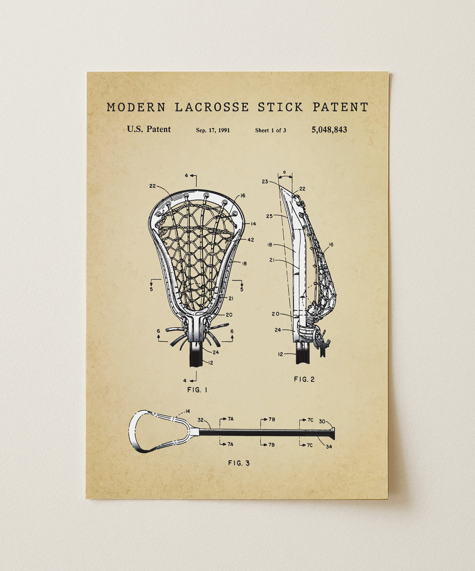 Evolved equipment, refined execution: this print takes the patent of a modern lacrosse stick and paints its structure with clarity. The mesh, the handle, the angle of throw—all visible in crisp detail, celebrating both heritage and progress.
