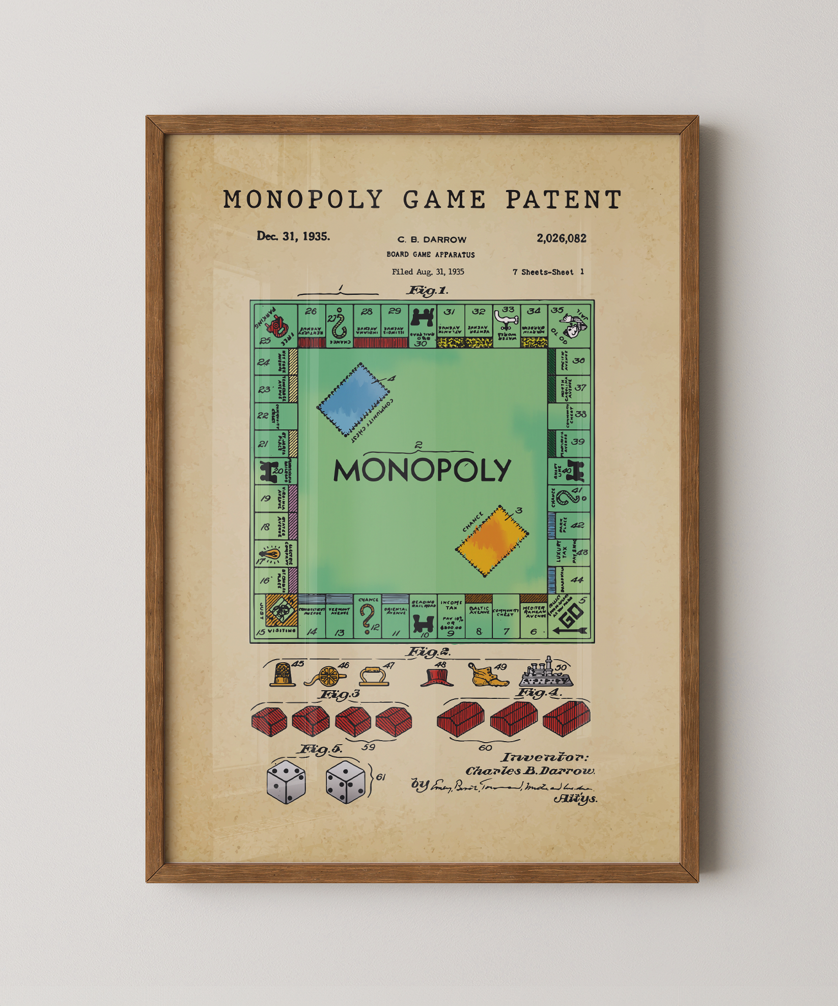 The roll of dice, the flip of a card, property acquired—captured in the patent drawing of a game-changing board. This print recreates the Monopoly patent in paint, celebrating strategy, family nights, and the invention that turned play into legacy.