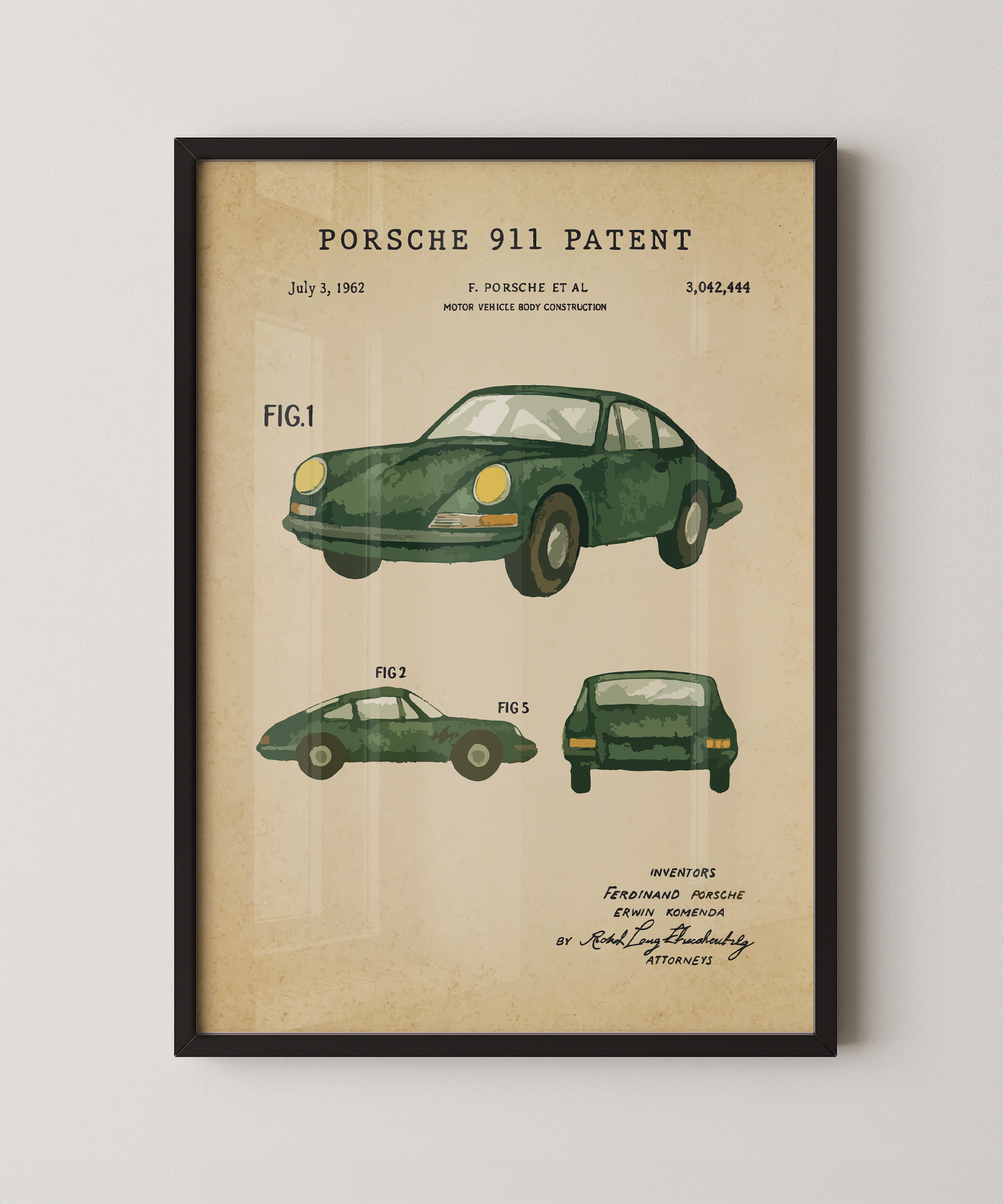 A design icon rendered in blueprint form. This print takes the patent drawings of the Porsche 911 and elevates them into art—each curve and contour painted with reverence for speed, precision, and legacy. For the dreamer of open roads and timeless design.
