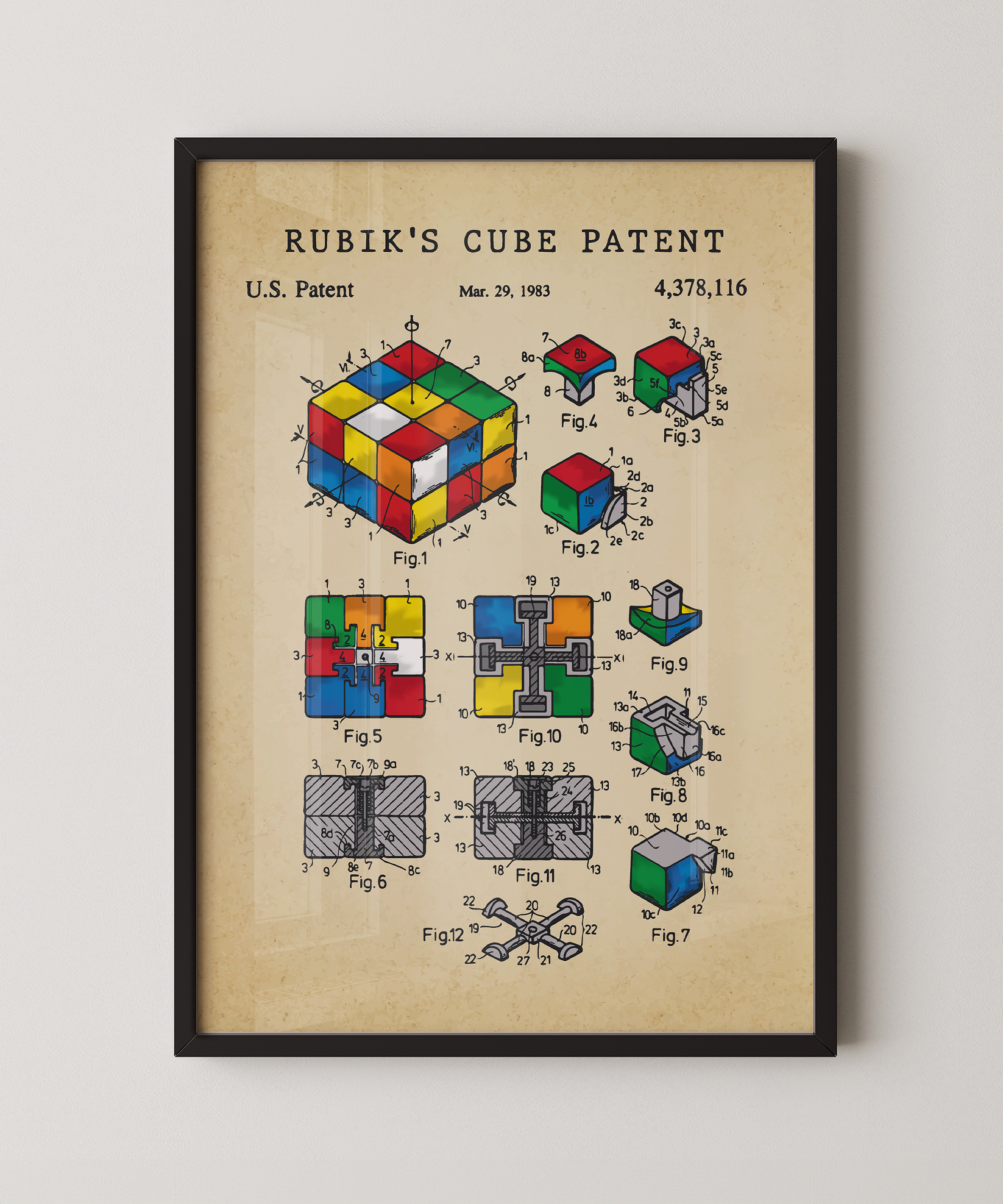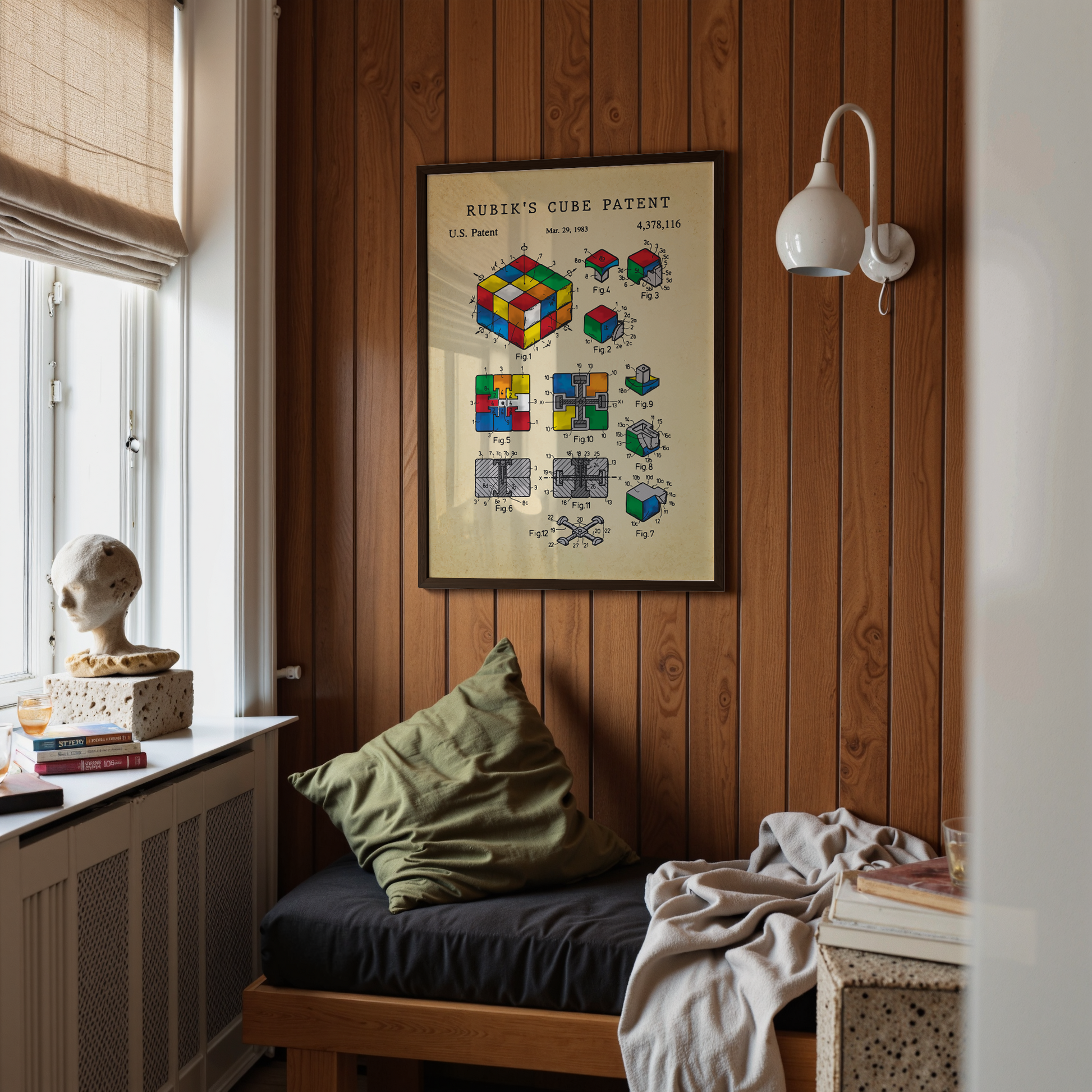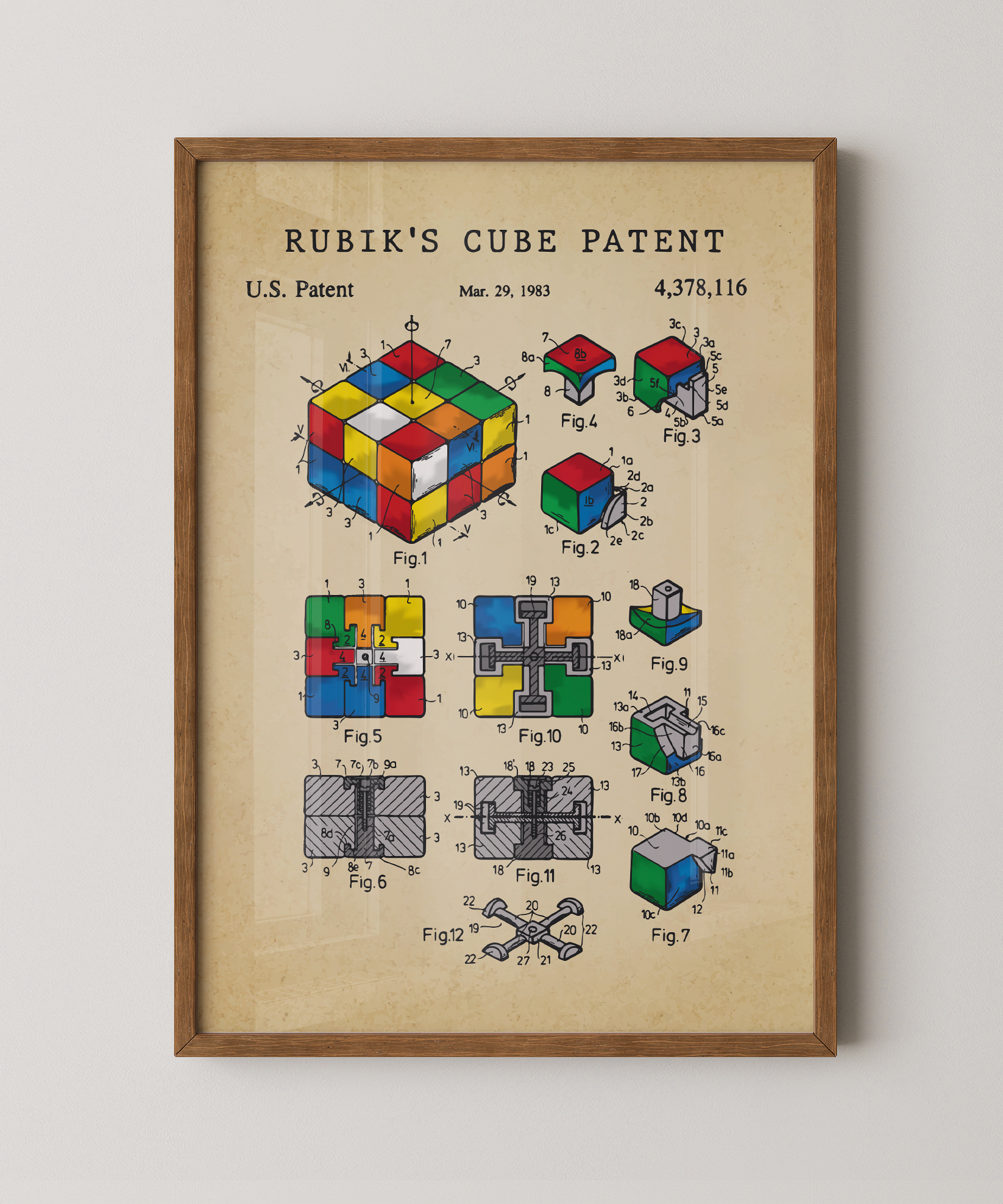 A twist of genius rendered in ink. This print honors the 1983 patent by Ernő Rubik that changed play forever, transformed into art. Ideal for puzzle enthusiasts, design lovers, or anyone who celebrates clever invention.