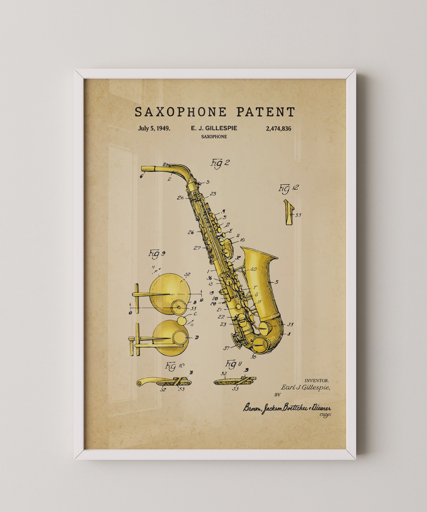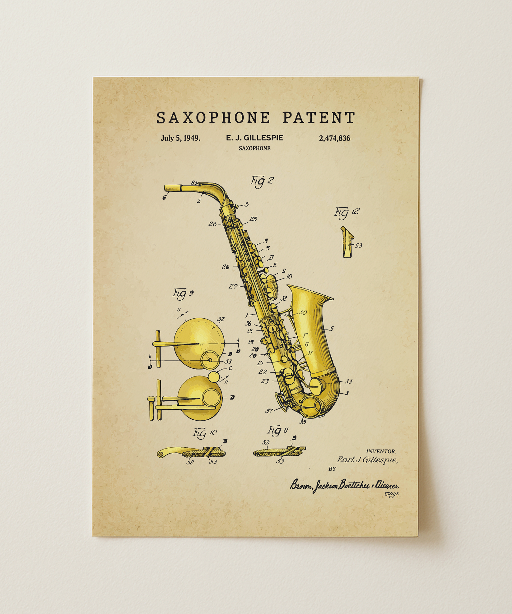 A voice of brass and breath drawn in graceful ink. This classic saxophone patent elevates its curving form and thoughtful mechanics into refined wall art that feels both timeless and expressive. Hung in your space, its lines evoke warm tones, late-night sessions, and the poetry of sound in motion. A tribute to design, motion, and the enduring spirit of creative invention.
