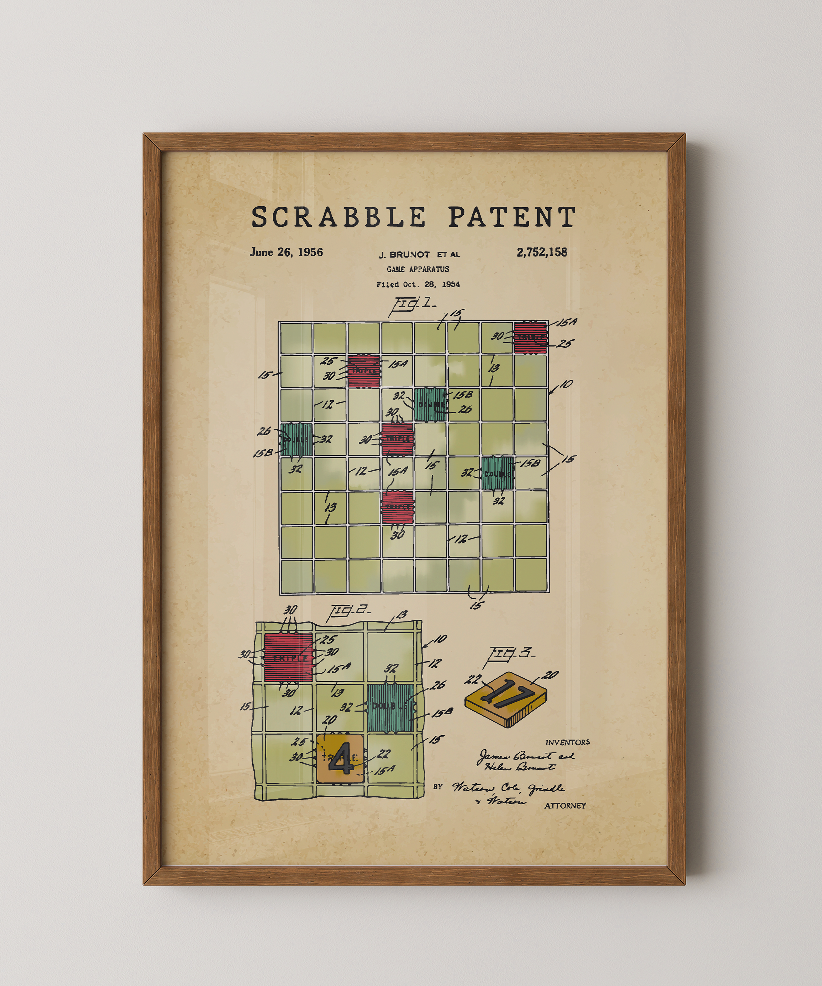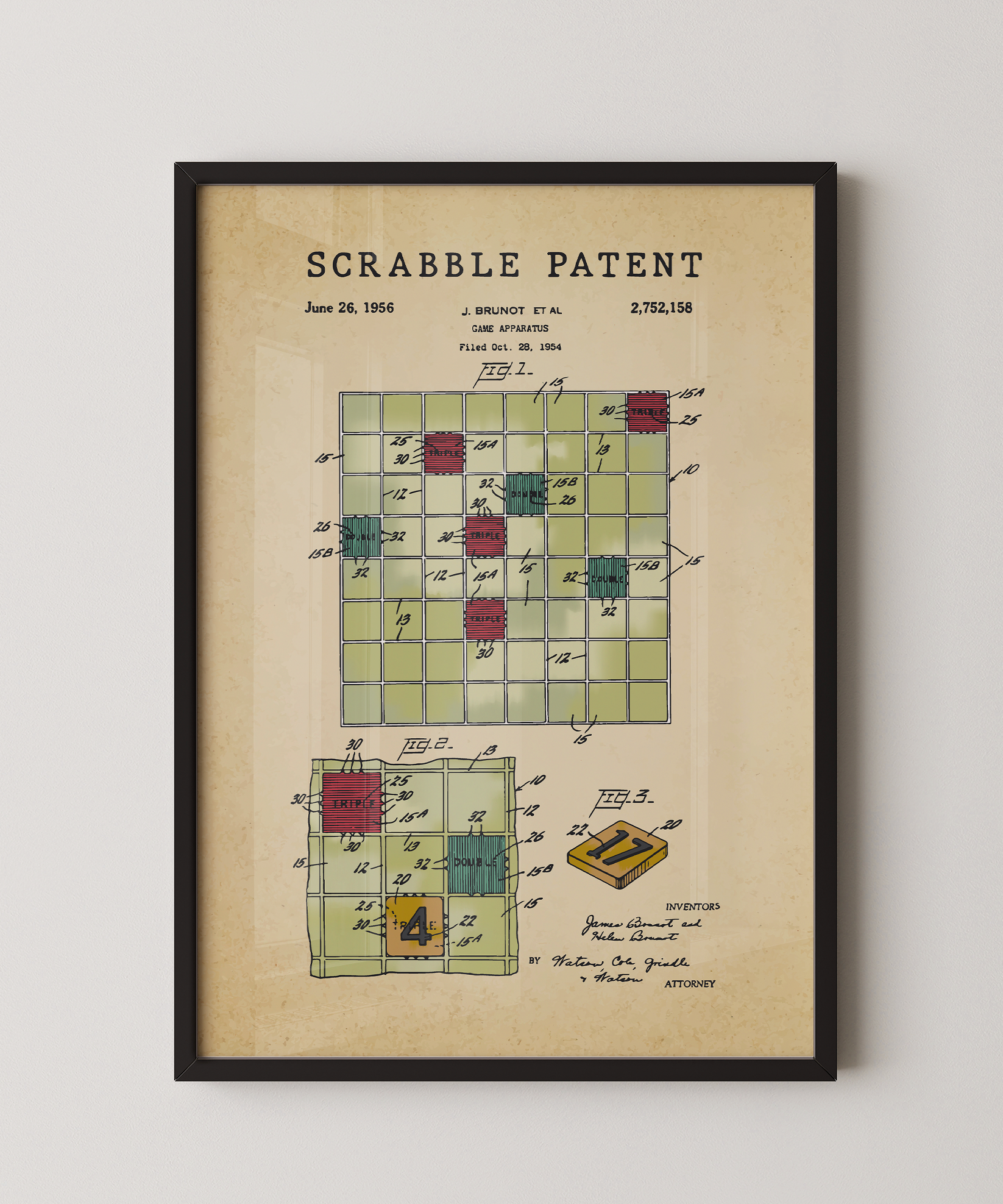 Letters, strategy, and a legacy of friendly competition — this printed patent paints the invention of Scrabble into a nostalgic keepsake. A reminder that simple tiles can spark connection, cleverness, and classic memories.