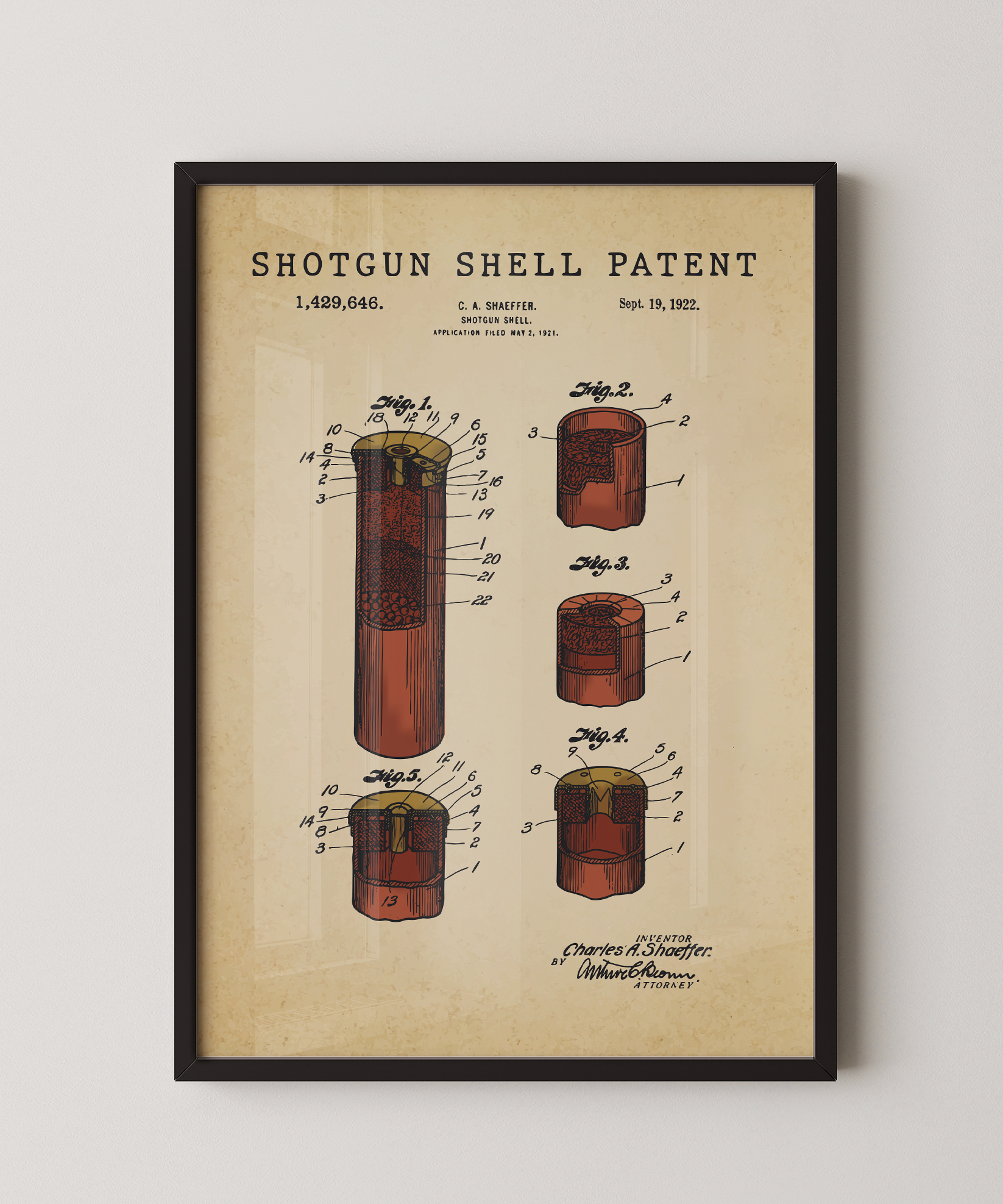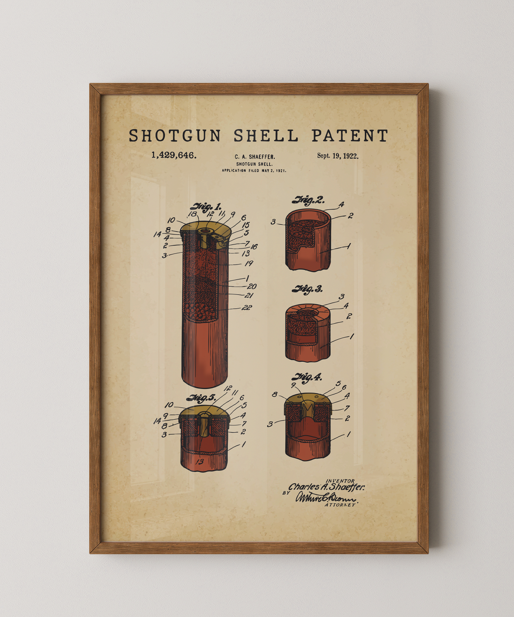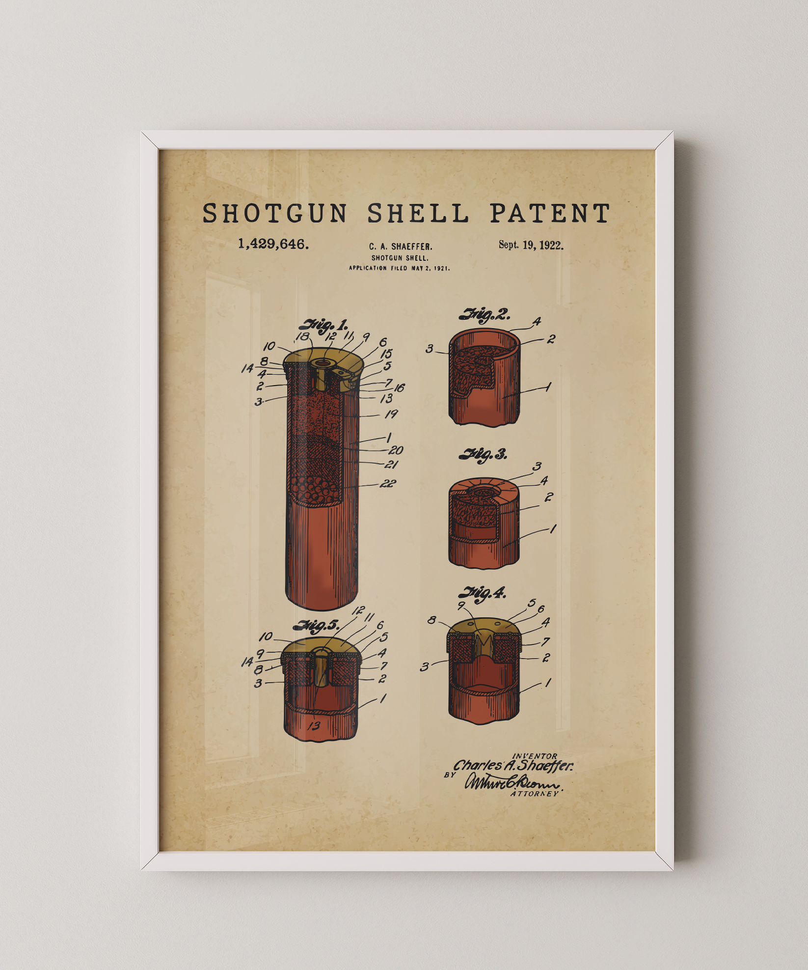 A slender echo of purpose drawn in elegant ink. This classic shotgun shell patent elevates its thoughtful form into refined wall art that feels both timeless and deliberate. Hung in your space, its lines evoke quiet woods, shared traditions, and the discipline of craft. A tribute to design, motion, and the enduring spirit of creative invention.