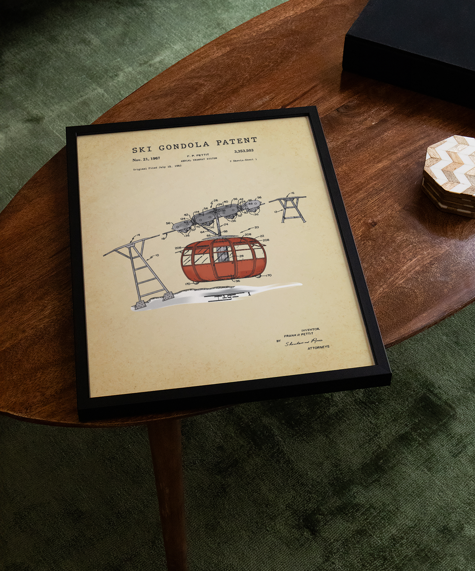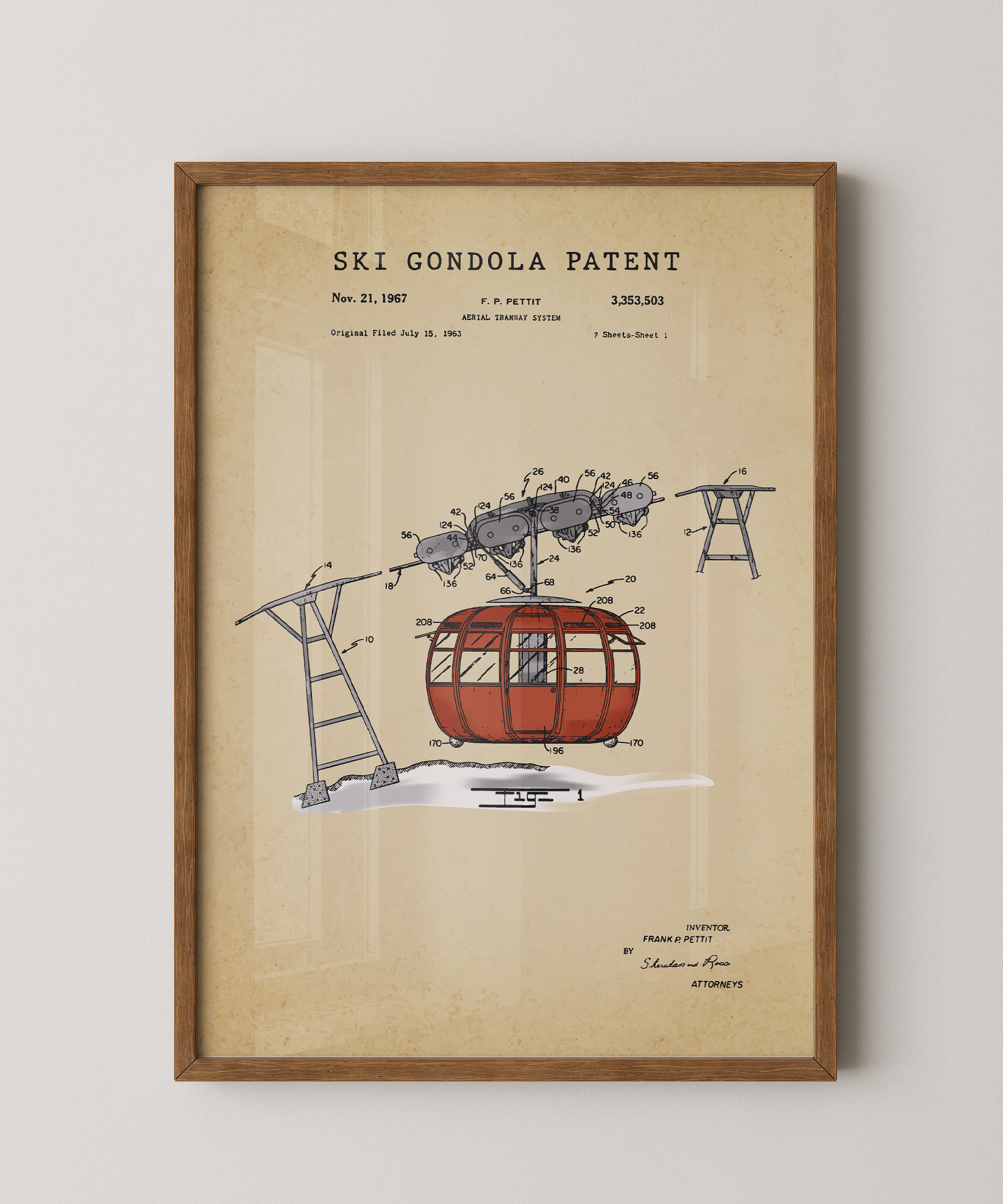 Elevation and adventure — this painted gondola patent print captures the calm before the climb. A tribute to mountain views, fresh powder, and journeys upward.