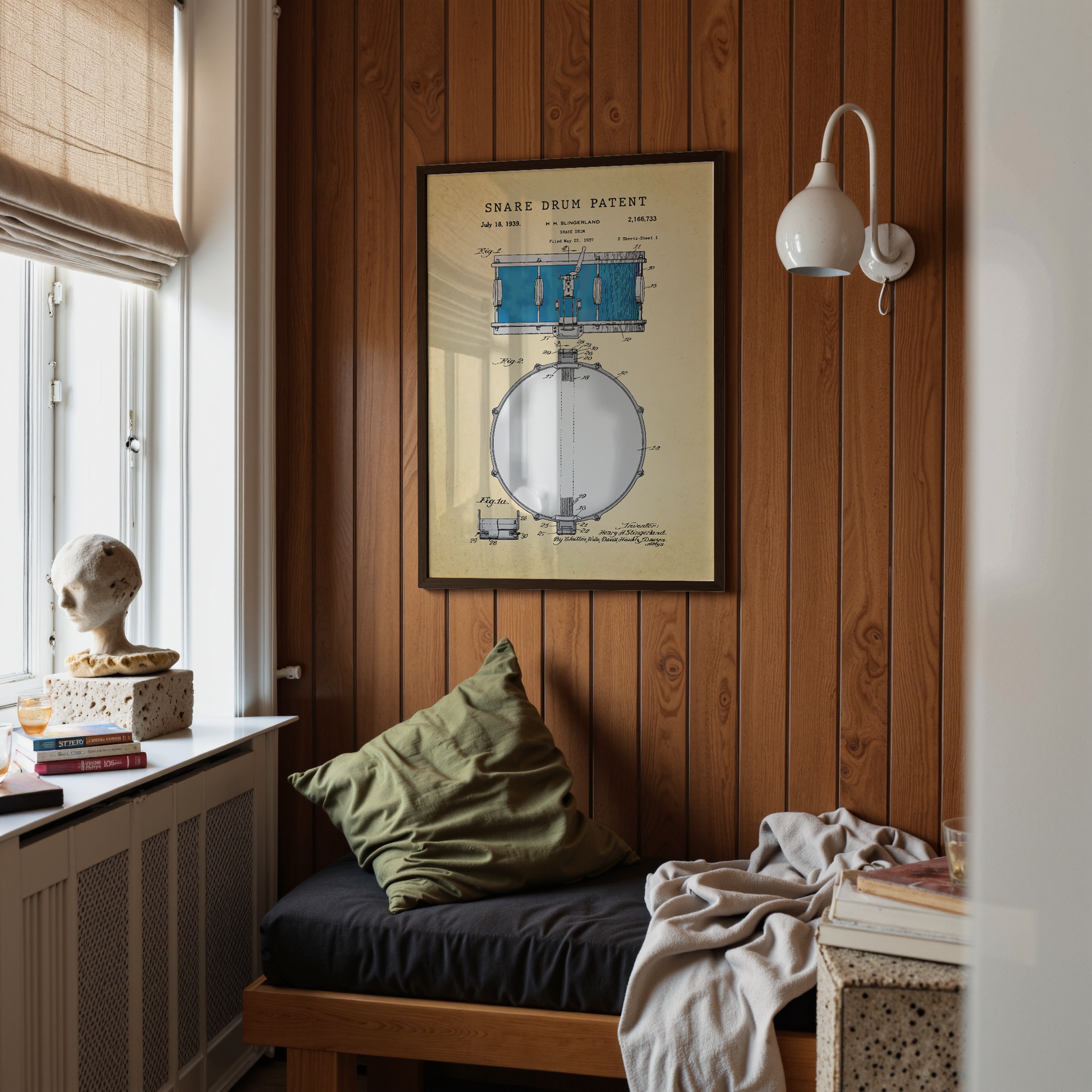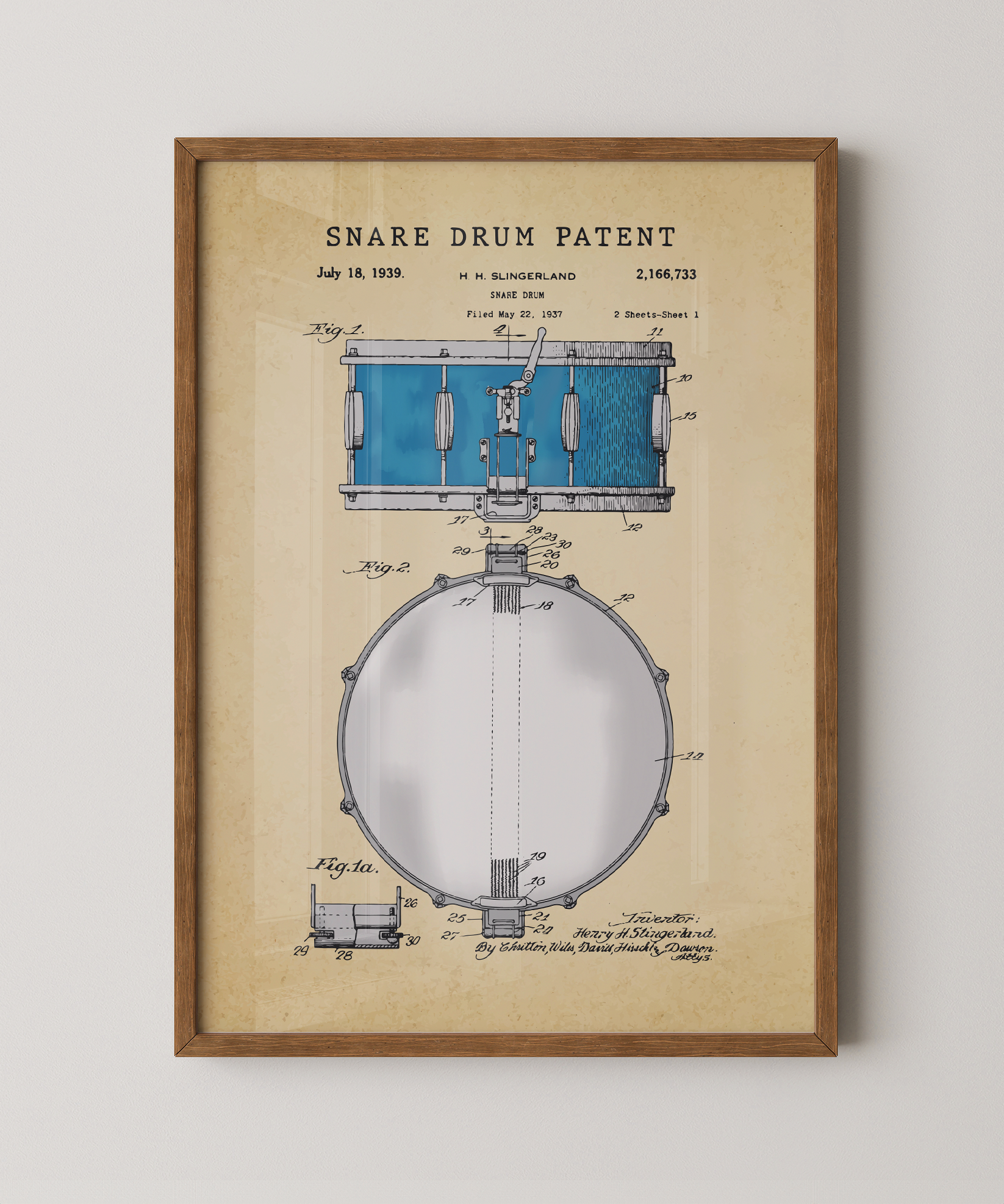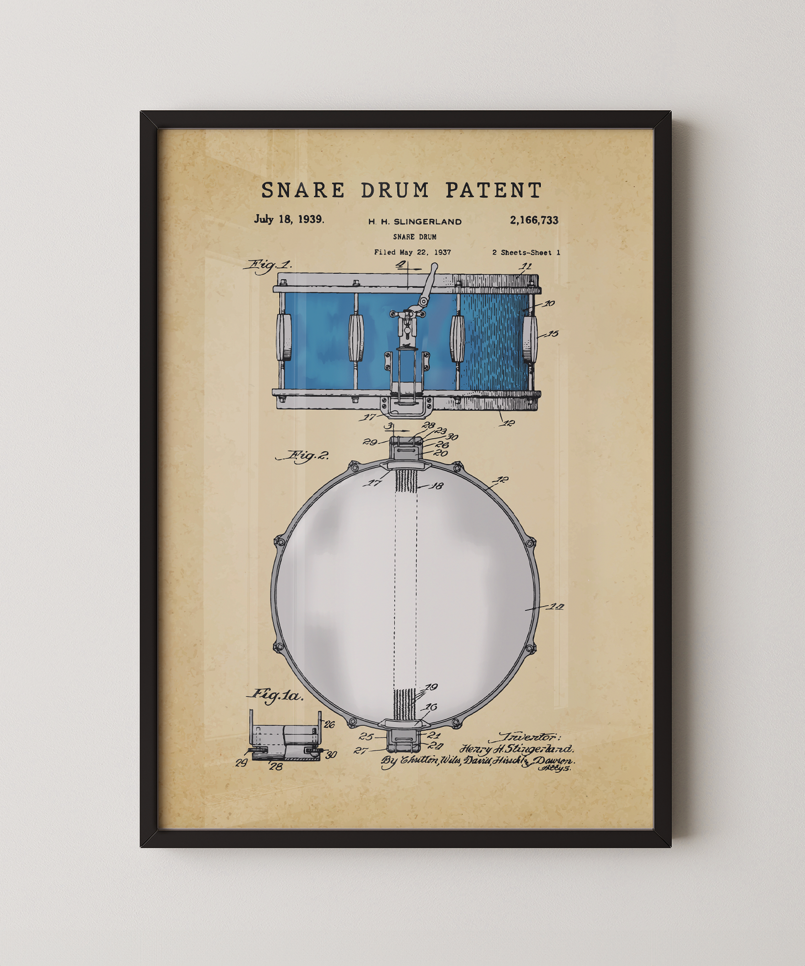Tension, rhythm, anticipation — this painted patent print celebrates the snare drum’s design. You can feel the build before the beat, the heartbeat of a band, the spark of sound waiting to erupt.