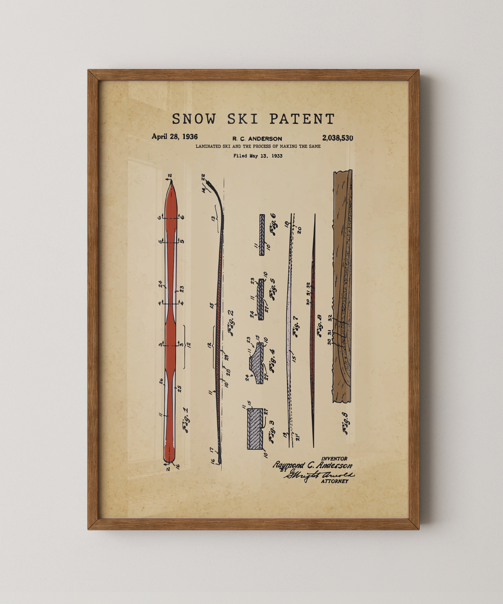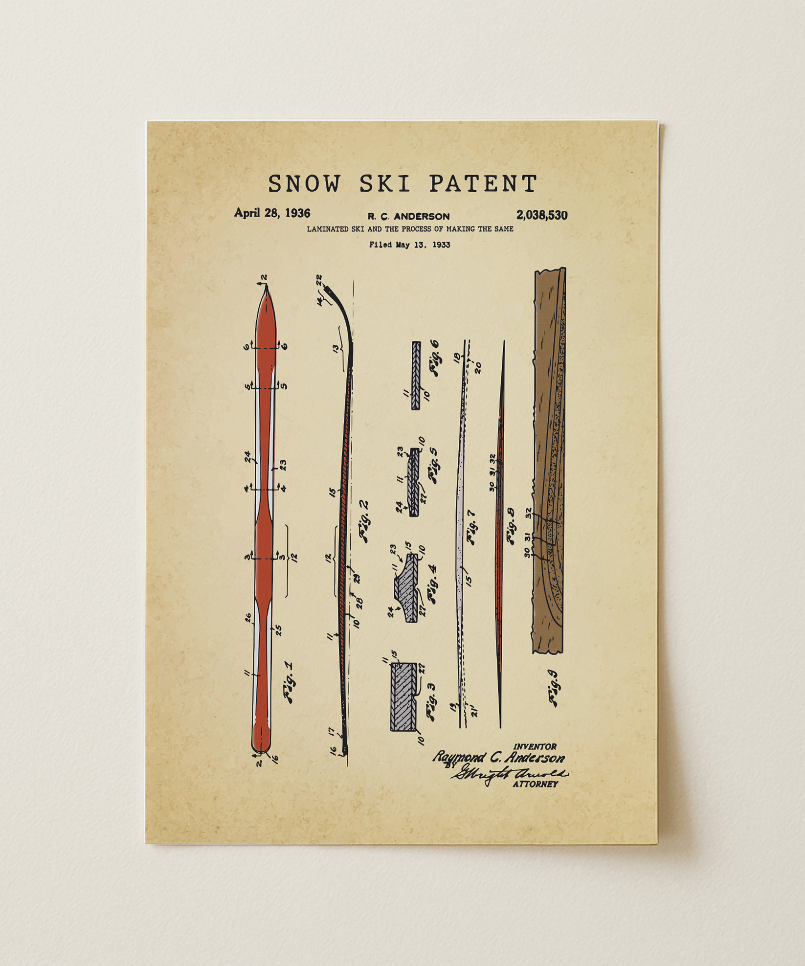 That first glide down a pristine slope, crisp air and pure speed—this print captures the patented ski design that made it possible. Every line of the original drawing, every carve in the snow imagined, becomes a painted tribute to freedom, precision, and the call of the mountain.