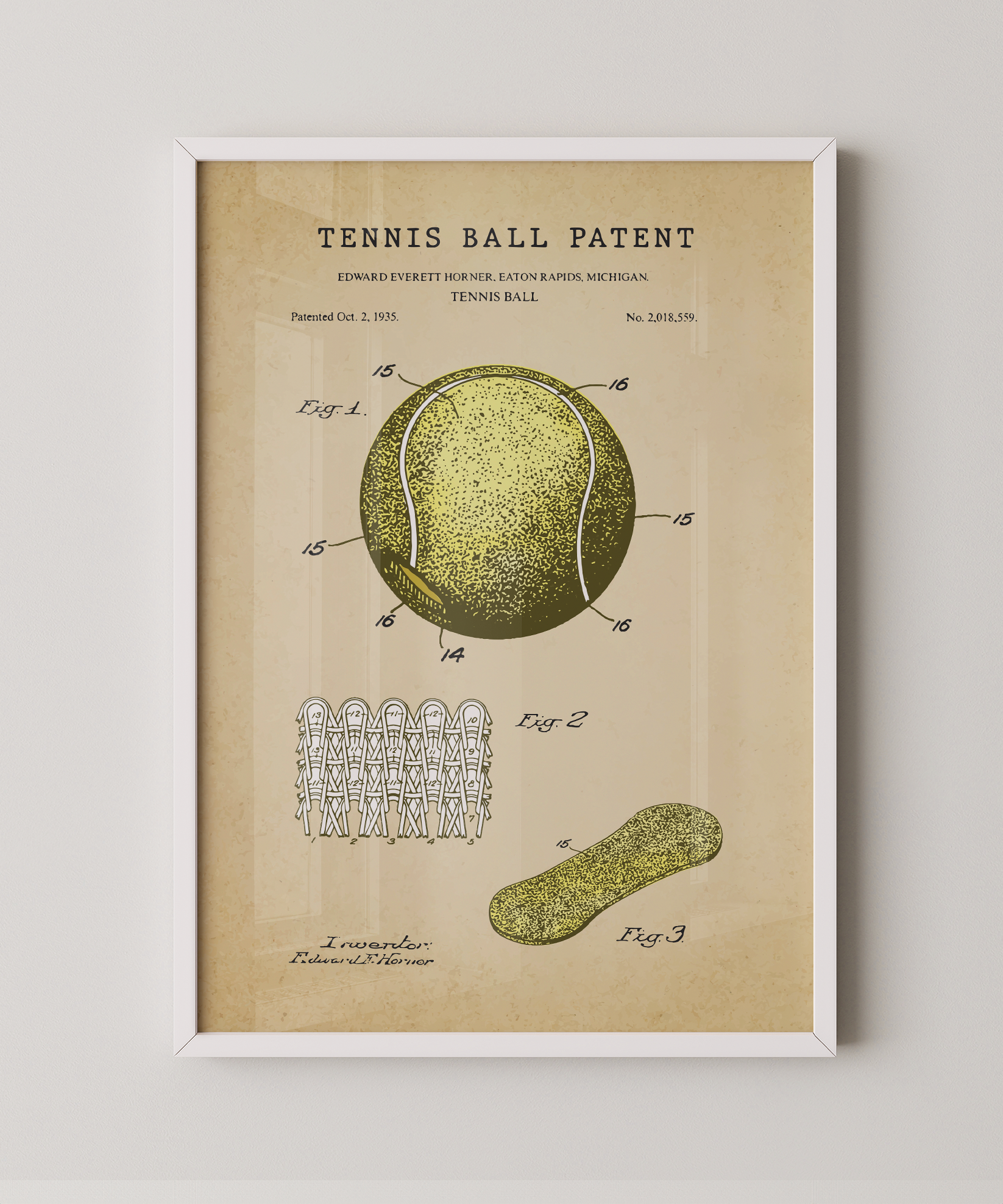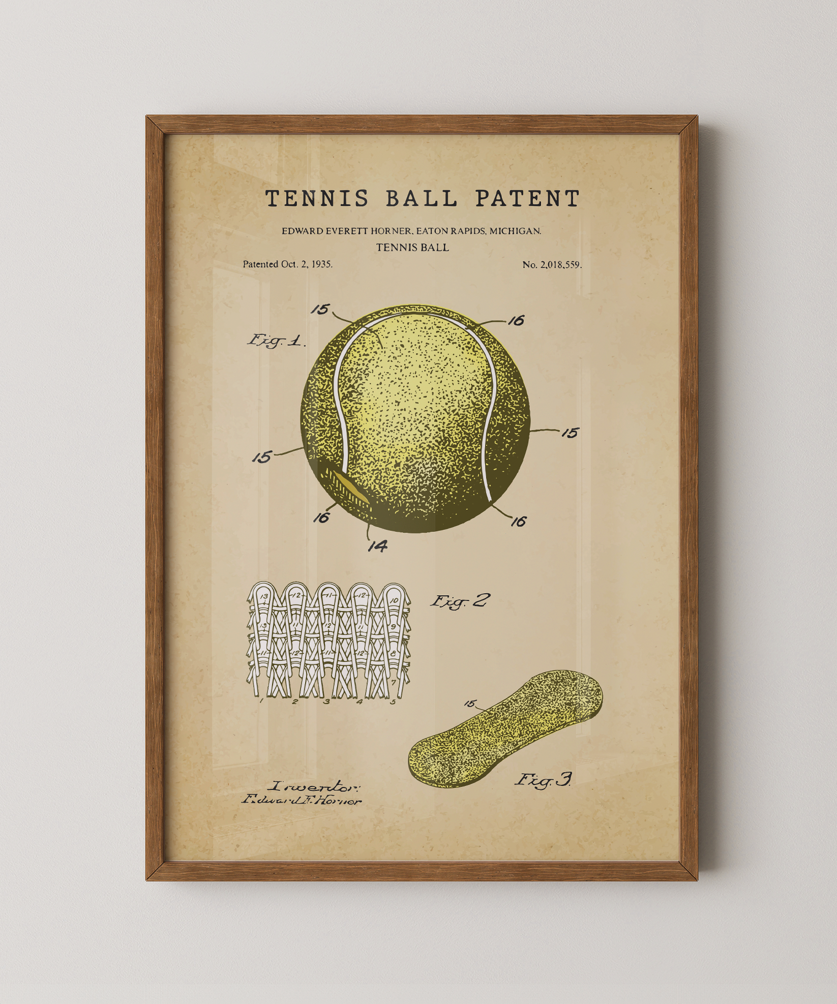 Wool, rubber, pressurized inside a fuzz of expectation: this print honors the patent of a tennis ball, capturing the geometry and tension within. A small object, big performance—rendered with care, ready to decorate walls and spark conversation.