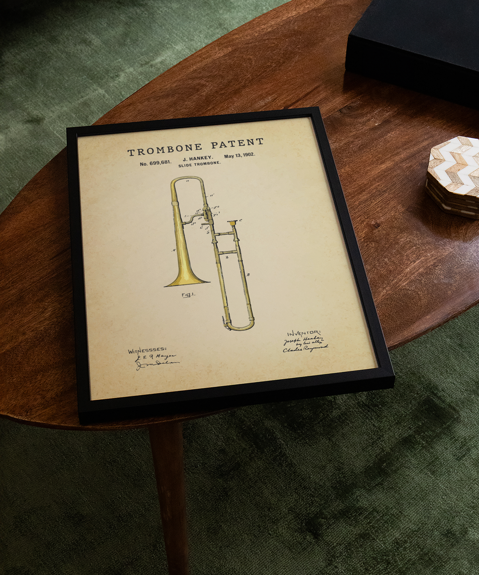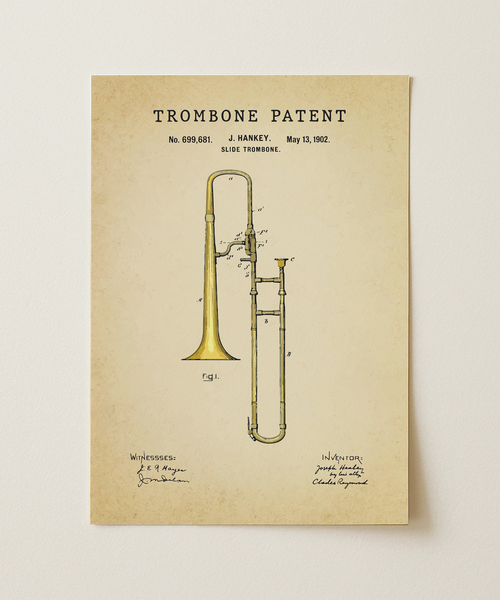 A silhouette of resonance drawn in graceful ink. This classic trombone patent elevates its elegant slide and curves into refined wall art that feels both timeless and expressive. Hung in your space, its lines evoke warm brass tones, soulful performance, and the poetry of sound in motion. A tribute to design, motion, and the enduring spirit of creative invention.